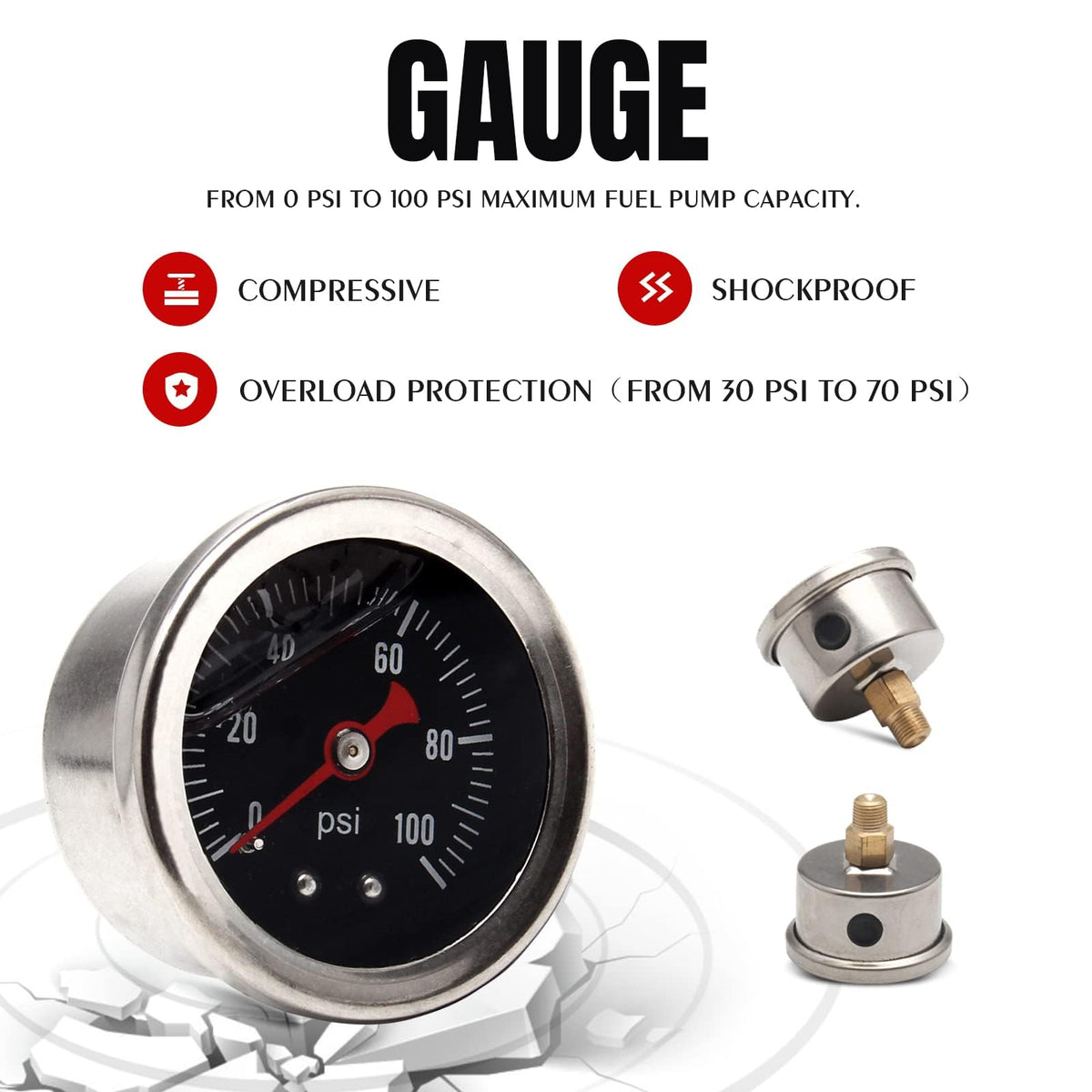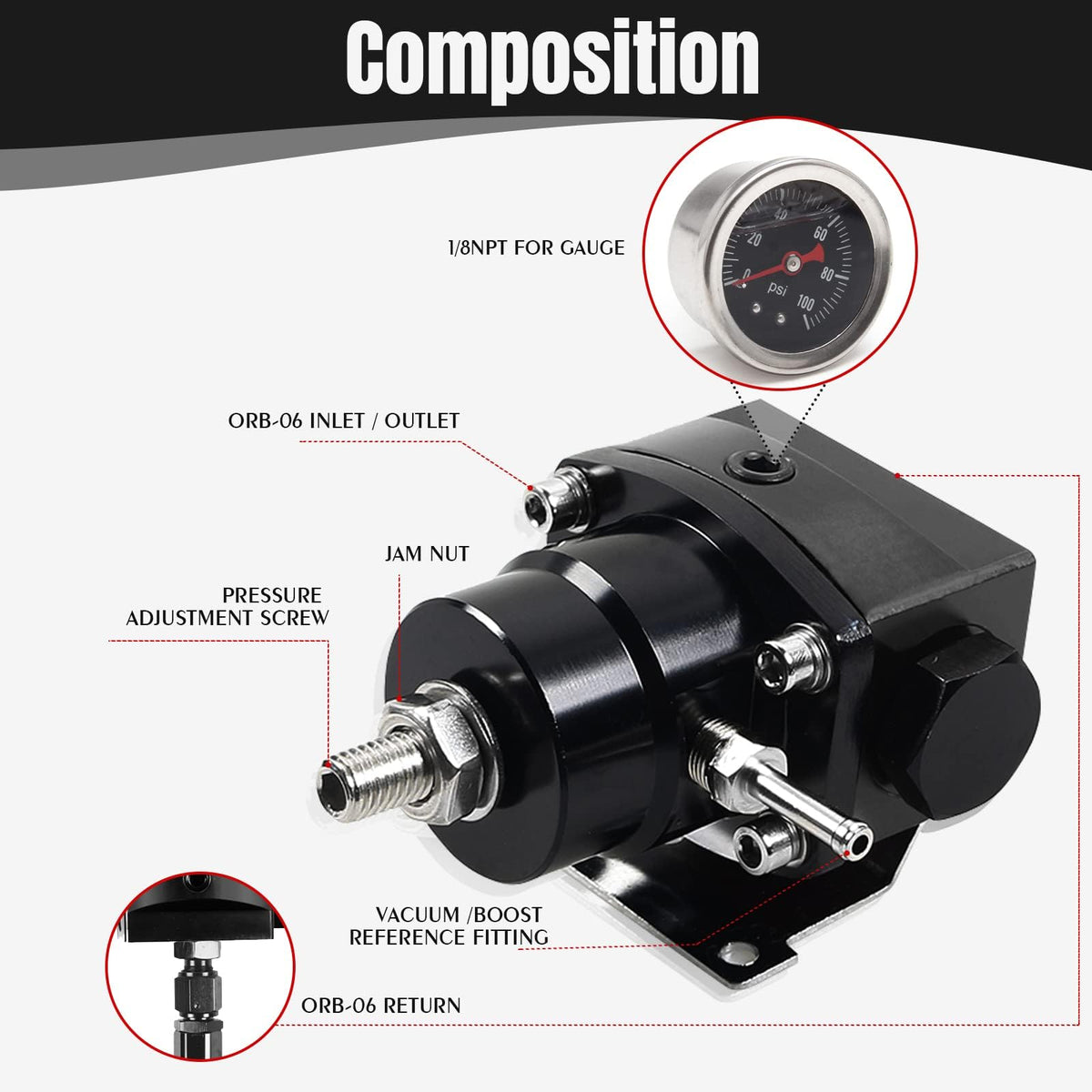 Condition: 100% Brand New.Color: BlackGauge range: 0-100psi. Characteristic:Regulates the pressure of the fuel in the system, even dramatic changes in fuel demand can always keep constant fuel pressure.The fuel injector can maintain the perfect ratio between fuel and boost and is good for promoting car performance, ensuring great lifespan and reliability.Package included:Bypass Adjustable Fuel Pressure Regulator *1Pressure Gauge *1AN-6 Port Plug *1AN-6 Straight adapter fittings *3AN-6 90 Degree adapter fittings *3Fuel rail adapter *1Fuel Regulator bracket *1AN-6 Braided Stainless Steel Fuel Line *3*Note: Instruction not included. Professional installation is highly recommended.