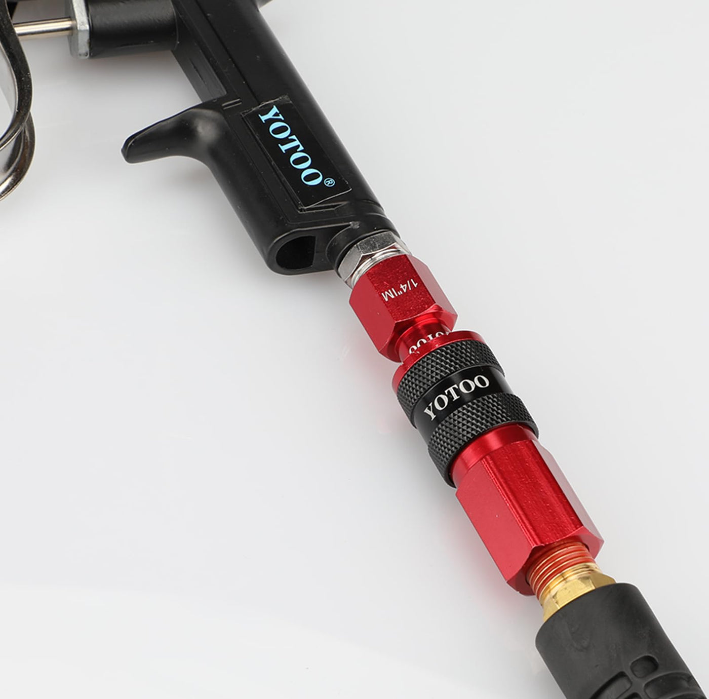DESCRIPTION: YOTOO 15-Piece 1/4-Inch Industrial Quick Coupler Kit helps you switch quickly between different air tools and accessories. It is ideal for any shop or garage to quickly and safely disconnect air hoses. The coupler is designed to rotate, preventing twisted hoses and easily locks tool onto air hoses. It features a durable, solid steel construction that is long-lasting and resistant to corrosion. The sleeve guard helps to reduce the risk of accidental disconnects and protects the coupler sleeve. This kit is also known as an air fittings kit, airline fittings kit, air hose fittings kit, air compressor fittings kit or air tool fittings kit according to its usage.