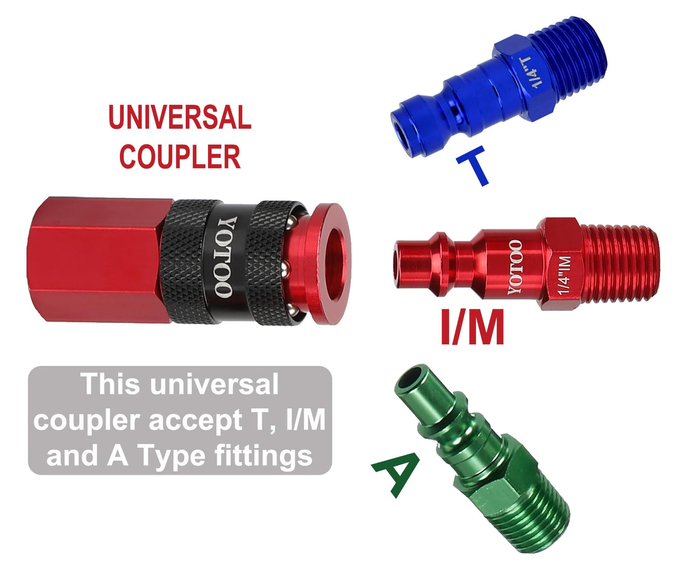 Q: Is the YOTOO air fittings kit compatible with most air tools?A: Yes, the 1/4" body and 1/4" thread universal coupler is designed to work well with automotive, industrial, and T-type air fittings, making it suitable for various air tools and compressor attachments.