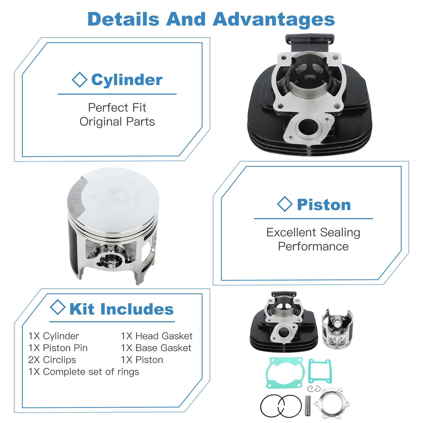 Q: What does the Cylinder Piston Gasket Kit include?A: The kit includes 1 Cylinder, 1 Head Gasket, 1 Base Gasket, 1 Piston, 1 Piston Pin, 2 Circlips, and a complete set of rings, providing everything needed for a top-end rebuild.