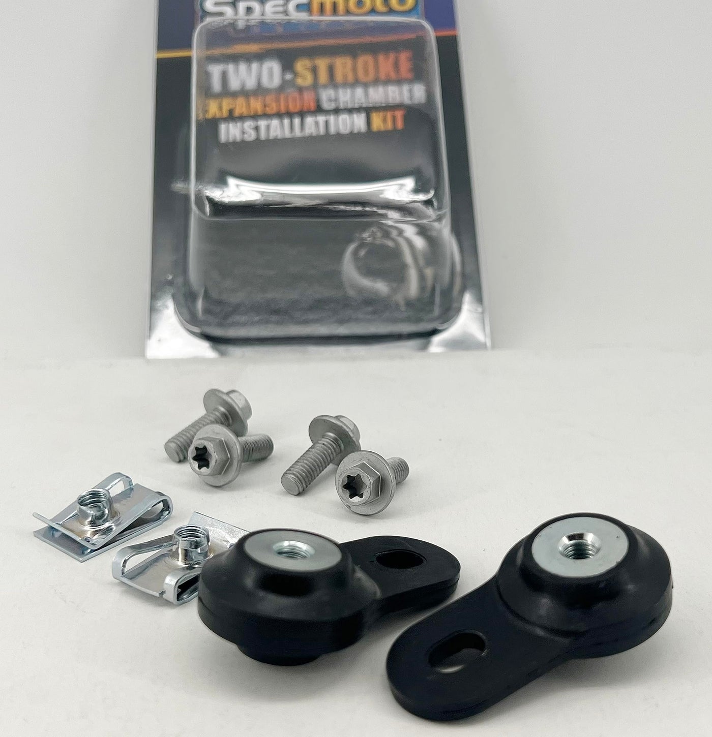 Q: What does the Specmoto Pipe Mount Kit include?A: The kit comes complete with expansion chamber mounts, clip nuts, and OEM matching bolts, providing everything you need to replace old or worn factory equipment.