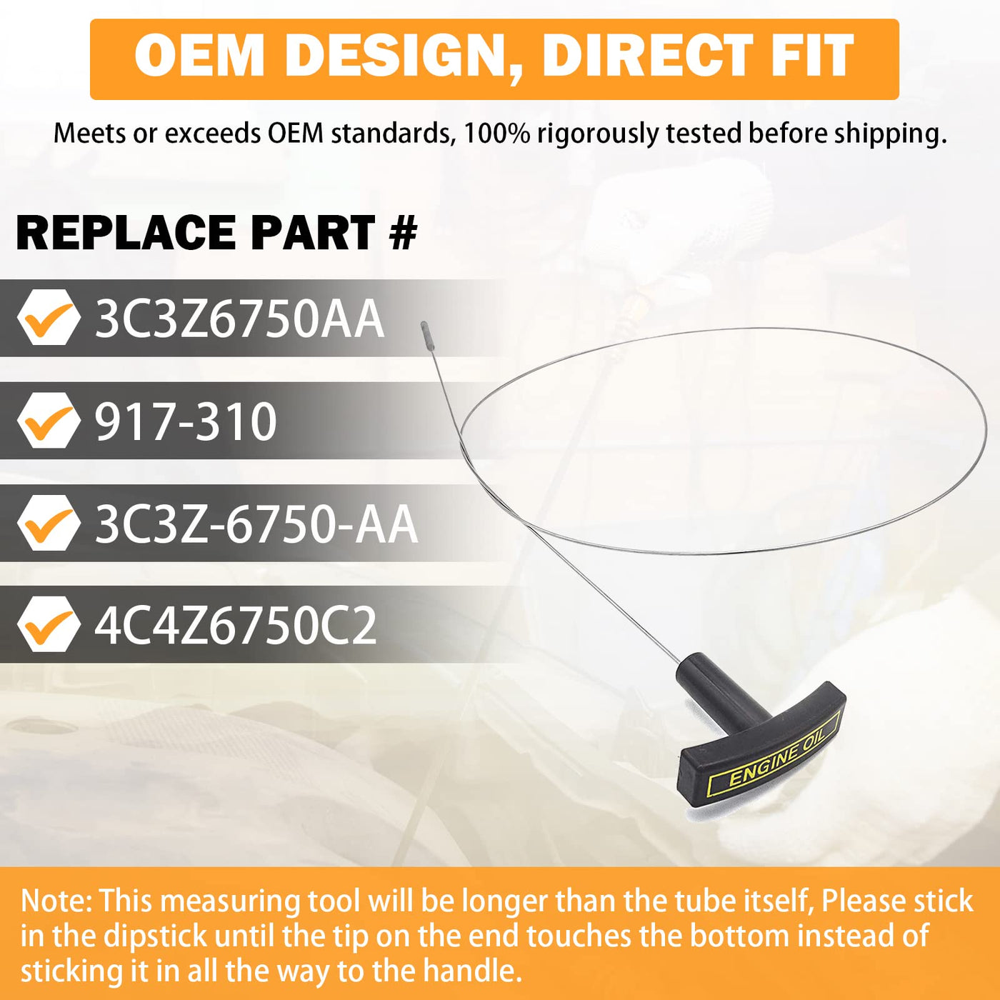 Q: Is the 3C3Z6750AA dipstick a direct replacement for OEM parts?A: Yes, the 3C3Z6750AA dipstick is designed as a direct replacement for OEM parts, including part numbers 3C3Z-6750-AA and 917-310, ensuring a perfect fit and functionality.