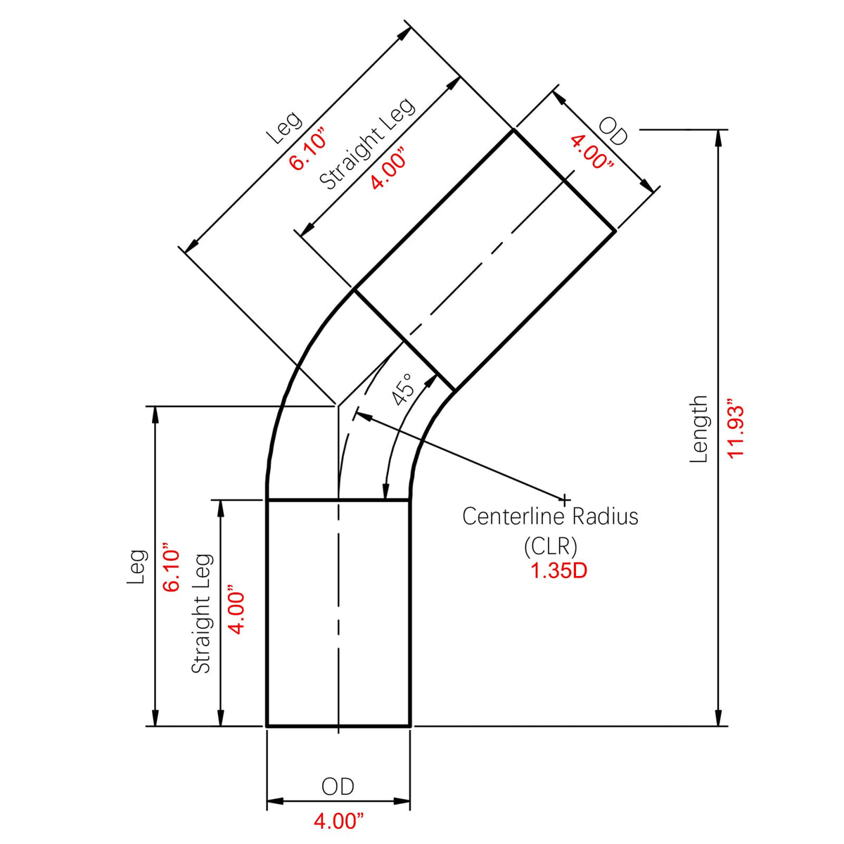 Ac Performance 4'' (102Mm) Od 45 Degree Aluminum Elbow Intercooler Pipe Air Intake Tube, 1.35D Radius, Brushed Finish