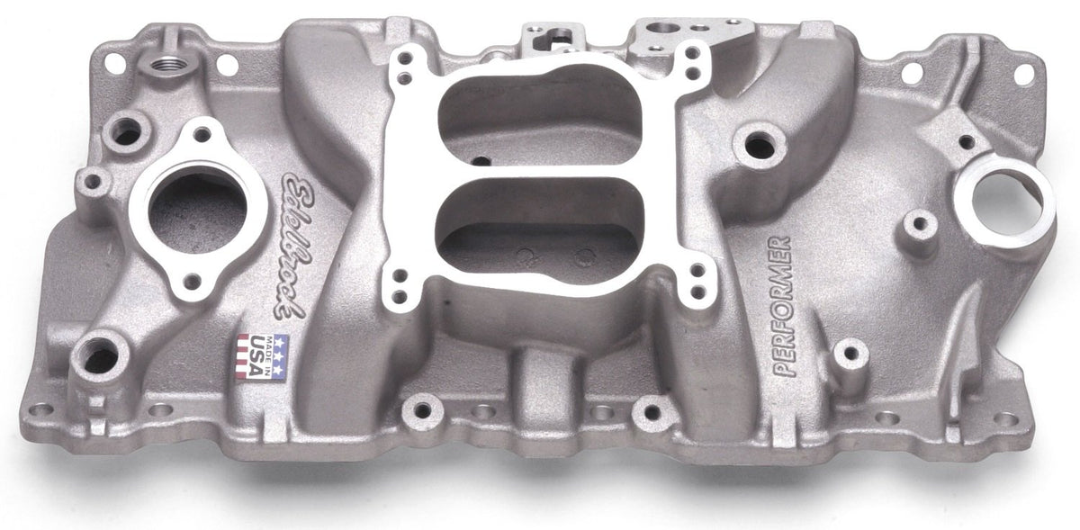 The Edelbrock Performer Intake Manifold is manufactured from aluminum and given a natural finish. They feature a patented runner design and have an EGR (Exhaust Gas Recirculation) provision. This boosts the torque and horsepower over a wide RPM range, from off-idle to 5, 500 RPM. This Performer Series intake is for 4-barrel carburetors and it has a spread bore flange. They accept late-model choke, water neck, alternator, and air conditioning brackets and HEI (High Energy Ignition) system.