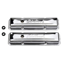 The Edelbrock Signature Series Valve Cover is engineered for serviceability and styled for excitement. The O. E. (Original Equipment) style breather baffles prevent excessive oil usage through the PCV valve. The overall height of this valve cover is 2. 8 inch. This cover accepts all emissions equipment, including the PCV valve. The rubber grommets for the breather hole are included. This low profile valve cover clears air-conditioning and alternator brackets. The matching breathers are sold separately.