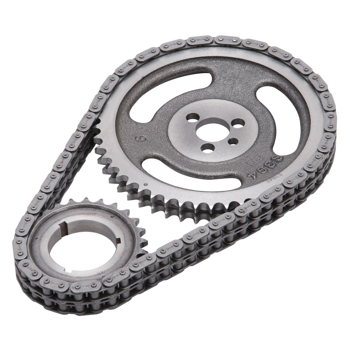 The Edelbrock Performer-Link True Rolling Timing Chain Set is used with either performance or stock cams. This set has a solid-bushing chain for a true bearing surface that rolls with the sprockets, eliminating chain stretch. The crank gears are machined and made from billet SAE-1144 steel and induction heat-treated. The cam sprockets are made from 35, 000 PSI tensile strength cast iron. Most sets have three keyways to ensure accurate timing for early or late-model vehicles, and allows to set cam timing 4 degrees advanced, 4 degrees retarded, or stock. The Performer-Link timing sets are not for use above 6, 500 RPM. The thrust bearing, offset bushings, gaskets, bolts and studs are not included.