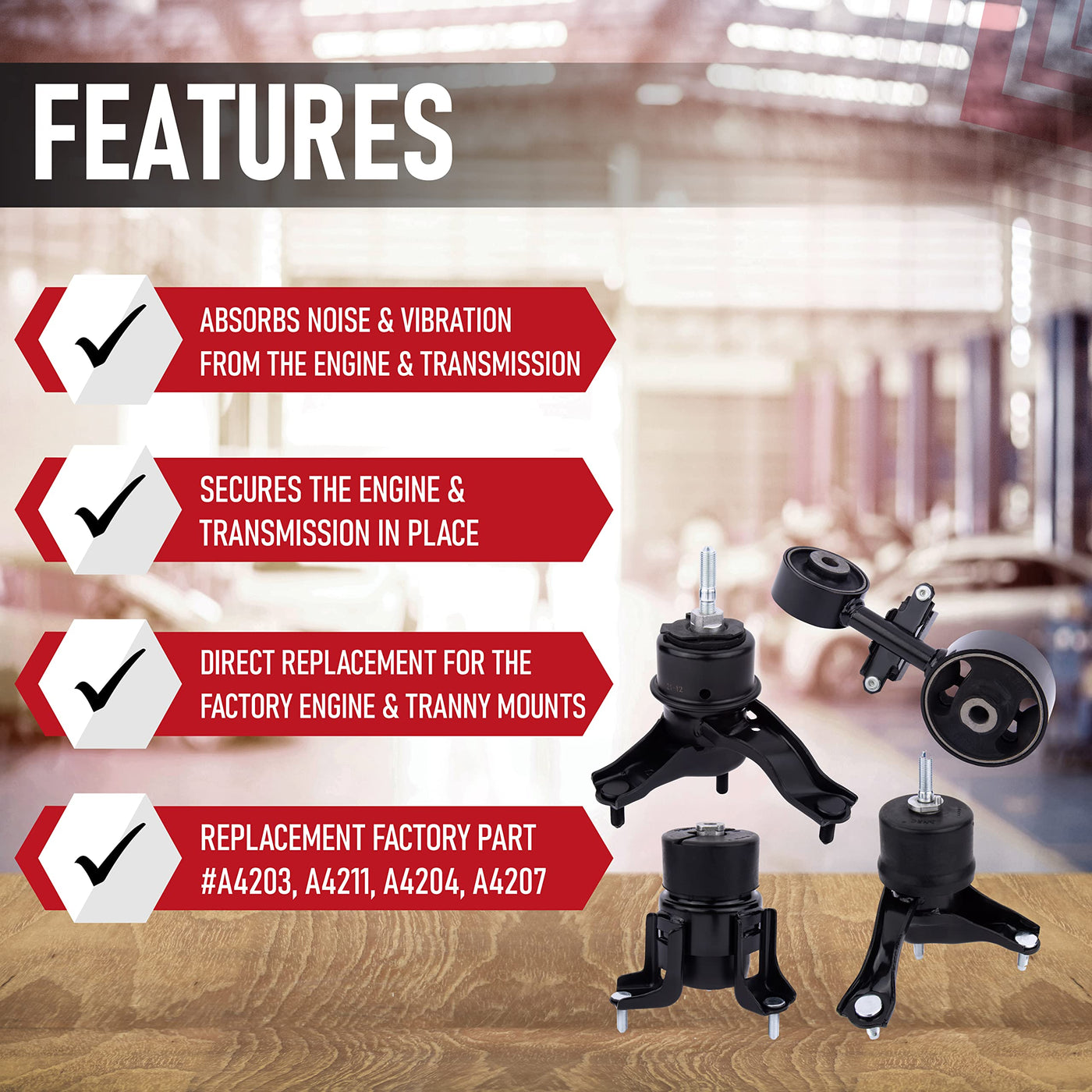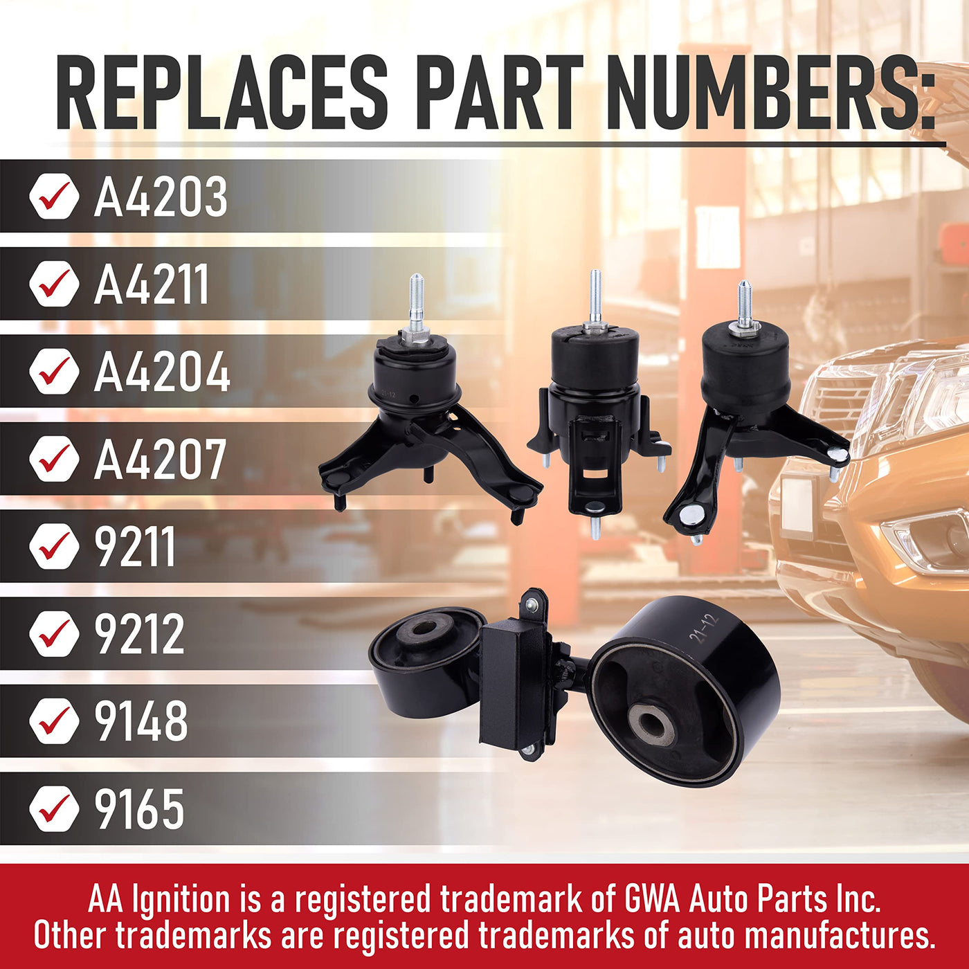 The engine motor mounts absorb noise and vibrations from the engine while securing it in place. Having put through constant pressure, these engine mounts do not last forever and will need replacing after some time. This engine mount kit also has antifreeze in it to prevent it from cracking under extreme cold weather conditions. If you are hearing clunks and feel like the engine is bouncing during stops or sudden acceleration then this may likely be the culprit. This engine mounts fit all sides of the engine and transmission and can easily be located beneath the front body of the engine. It is advisable to replace all the mounts at once to maintain balance in the engine weight distribution. Compatible with the following vehicles: 2002-2006 Camry 2.4L Replaces part number: A4203, A4211, A4204, A4207, 9211, 9212, 9148, 9165 M9211, EM9212, EM9148, EM9165 This is a compatible replacement part manufactured by AA Ignition. This engine mount set is NOT a genuine OEM part. Vehicle makes and their associated models and part numbers are used in this listing only to identify the vehicles this engine and transmission mount kit fits.
