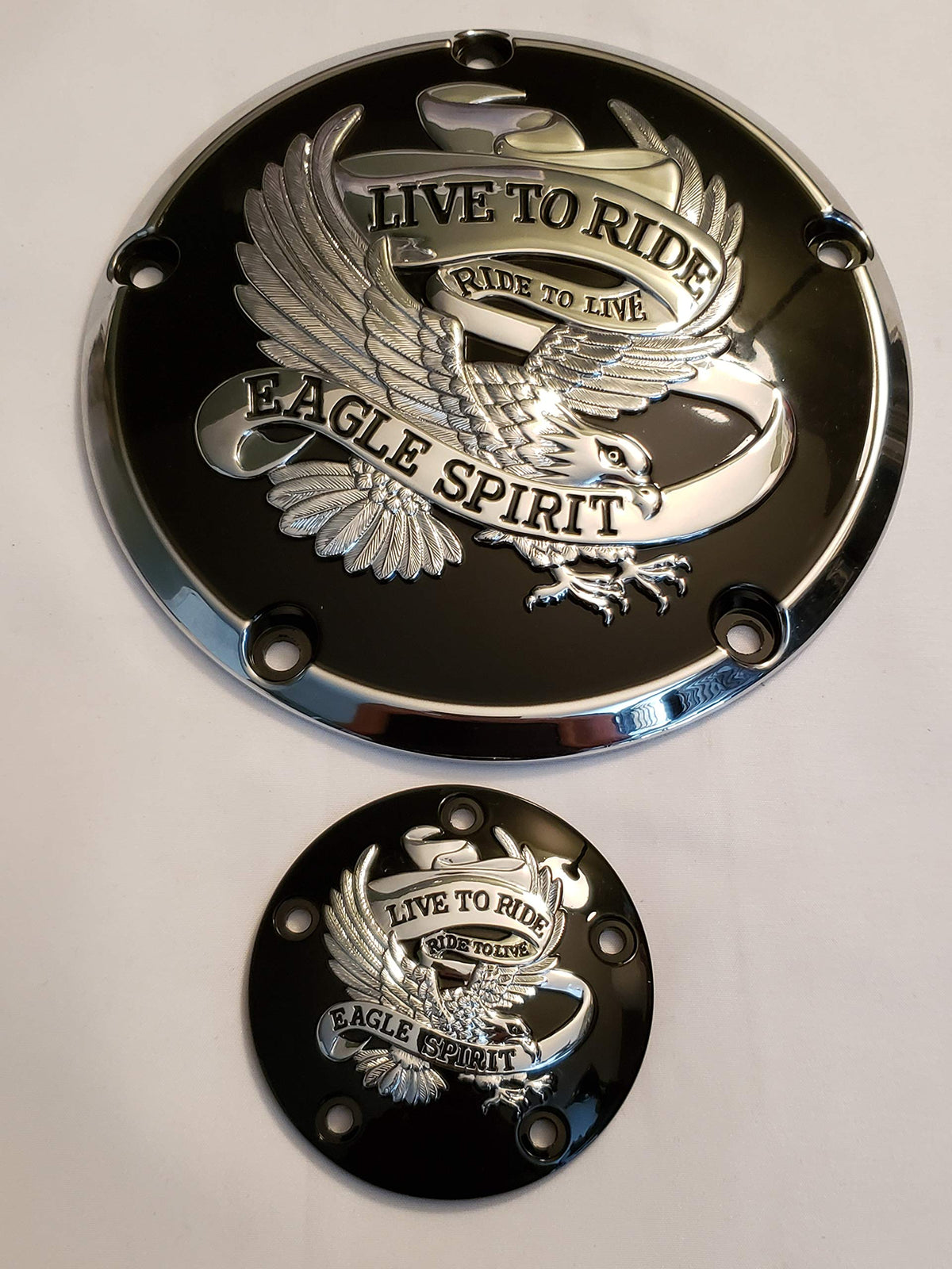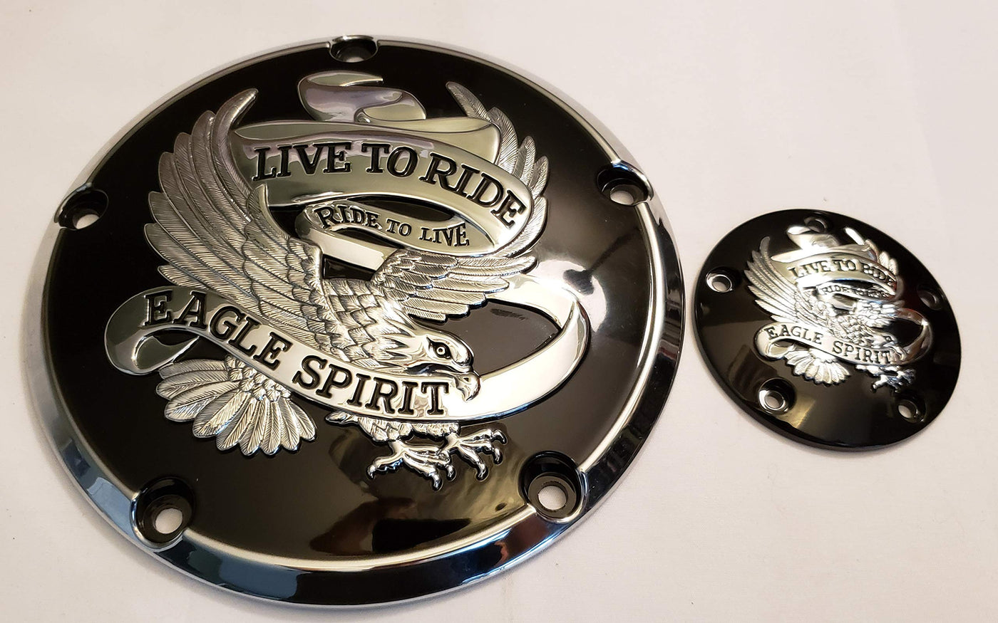 Black And Chrome 'Live To Ride' Derby And Ignition Timing Cover For Harley Twin Cams From 1999-2015 | Gloss Black | Both The Derby And Ignition Timing Cover Are 5 Hole Design | Hardware Not Included | Easy To Install