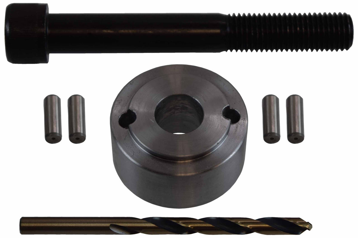 Q: What tools are included in the crank pin kit?A: The kit includes a drill sleeve fixture, a high-grade drill bit, a tool hold-down bolt, and two 1/4" diameter roll pins for secure installation.