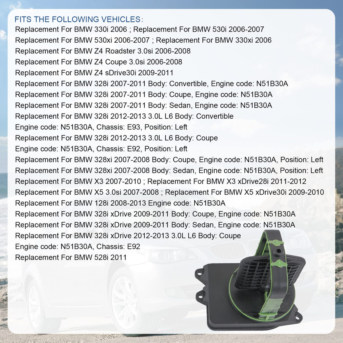 Replacement For Bmw 330I 2006 Replacement For Bmw 530I 2006-2007 Replacement For Bmw 530Xi 2006-2007 Replacement For Bmw 330Xi 2006 Replacement For Bmw Z4 Roadster 3.0Si 2006-2008 Replacement For Bmw Z4 Coupe 3.0Si 2006-2008 Replacement For Bmw Z4 Sdrive30I 2009-2011 Replacement For Bmw 328I 2007-2011 Body: Convertible, Engine Code: N51B30A Replacement For Bmw 328I 2007-2011 Body: Coupe, Engine Code: N51B30A Replacement For Bmw 328I 2007-2011 Body: Sedan, Engine Code: N51B30A Replacement For Bmw 328I 2012-2013 3.0L L6 Body: Convertible, Engine Code: N51B30A, Chassis: E93, Position: Left Replacement For Bmw 328I 2012-2013 3.0L L6 Body: Coupe, Engine Code: N51B30A, Chassis: E92, Position: Left Replacement For Bmw 328Xi 2007-2008 Body: Coupe, Engine Code: N51B30A, Position: Left Replacement For Bmw 328Xi 2007-2008 Body: Sedan, Engine Code: N51B30A, Position: Left Replacement For Bmw X3 2007-2010 Replacement For Bmw X3 Xdrive28I 2011-2012 Replacement For Bmw X5 3.0Si 2007-2008 Replacement For Bmw X5 Xdrive30I 2009-2010 Replacement For Bmw 128I 2008-2013 Engine Code: N51B30A Replacement For Bmw 328I Xdrive 2009-2011 Body: Coupe, Engine Code: N51B30A Replacement For Bmw 328I Xdrive 2009-2011 Body: Sedan, Engine Code: N51B30A Replacement For Bmw 328I Xdrive 2012-2013 3.0L L6 Body: Coupe, Engine Code: N51B30A, Chassis: E92 Replacement For Bmw 528I 2011