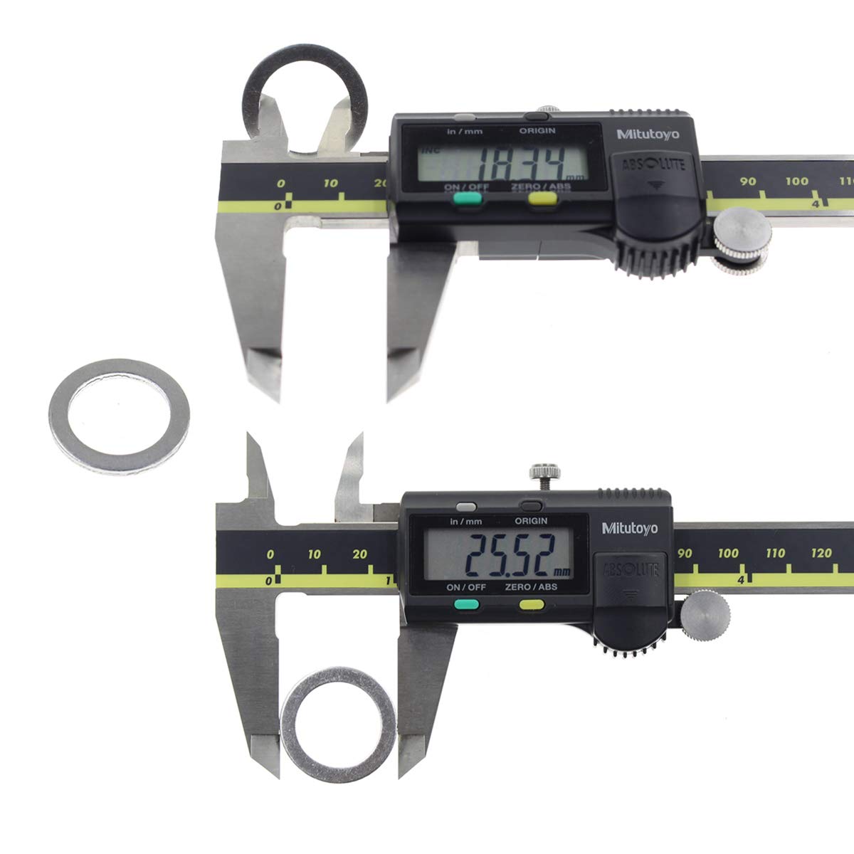 Q: What are the dimensions of the MOTOALL Drain Plug Crush Washer?A: The MOTOALL Drain Plug Crush Washer has an outside diameter of 25.5 mm (1 inch), an inside diameter of 18 mm (0.71 inch), and a thickness of 1.95 mm (0.08 inch).