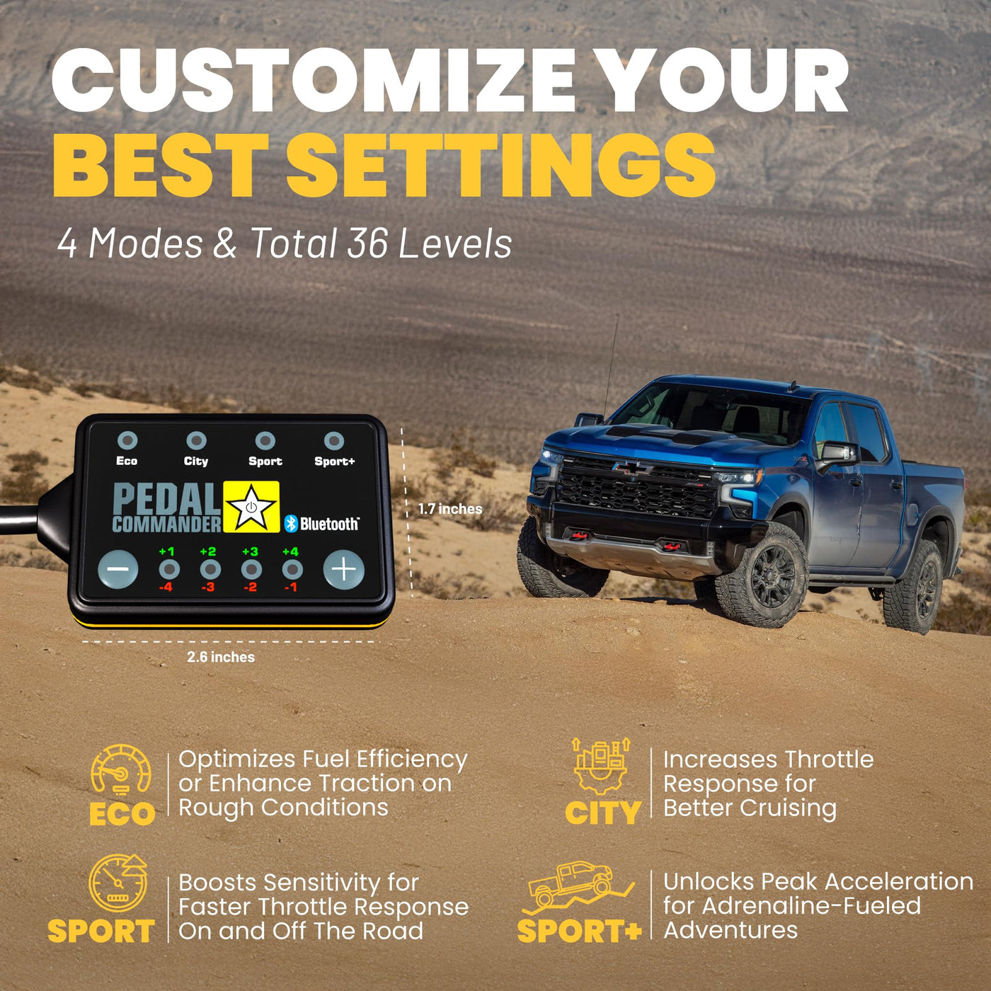 Q: How does the Pedal Commander improve throttle response in my Chevrolet Silverado?A: The Pedal Commander enhances throttle response by eliminating the delay caused by modern electronic throttle systems. It offers four modes — Eco, City, Sport, and Sport+ — allowing you to adjust the sensitivity with 36 settings, giving you instant control over your vehicle's acceleration.