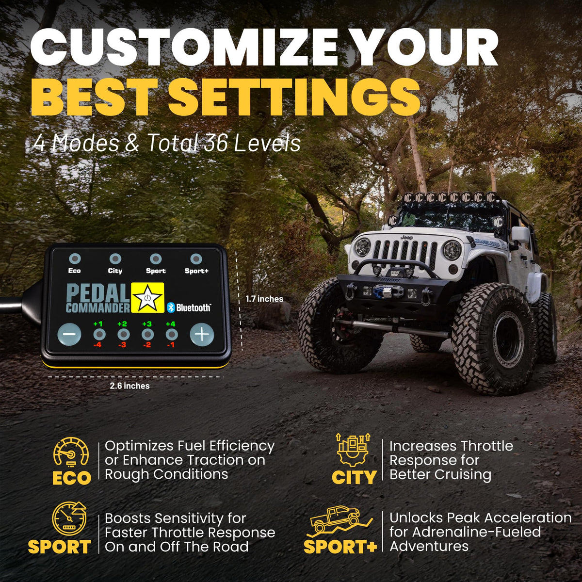 Faster Acceleration: Pedal Commander Eliminates The Delay From Your Gas Pedal, Allowing Your Jeep Wrangler Jk To Accelerate Faster, Giving Your Vehicle A Night/Day Difference In Performance | 36 Adjustable Settings: Equipped With 4 Different Modes: Eco, City, Sport, And Sport +. Each Mode Has An Additional 36 Adjustable Settings To Fine-Tune To Your Liking, Making. This Makes It One Of The Must-Have Jeep Wrangler Jk Accessories | Eco Mode: The Pedal Commander Throttle Response Controller Significantly Slows Throttle Response To Improve Efficiency | Quick & Easy Installation: Pedal Commander Is A Simple Plug-And-Play Device That Takes Only About 10 Minutes To Install. Now Bluetooth Compatible, You Can Control The Unit Using Our Free Pedal Commander App | Will Not Void Your Warranty: Pedal Commander Will Not Void The Warranty On Your Jeep Wrangler Jk Or Leave Any Trace Behind On Your Ecu | Please Ensure This Pedal Commander Fits Your Vehicle`S Model And Refer To Installation Instructions To Avoid Potential Issues. Pedal Commander Enhances Throttle Response For Your Jeep Wrangler Jk, Allowing Quicker Access To Existing Horsepower Without Adding Power. It Complements Various Vehicle Mods Like Tuners, Programmers, Cold Air Intakes, And Performance Chips