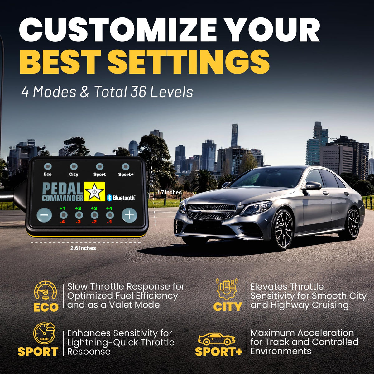 Q: What are the key features of the Pedal Commander throttle response controller?A: The key features of the Pedal Commander include enhanced throttle response that reduces lag during acceleration, 36 adjustable settings across 4 modes (Eco, City, Sport, and Sport +) to match your driving style, compatibility with specific Mercedes Benz C-Class models for seamless operation, and a straightforward installation process that requires no special tools.