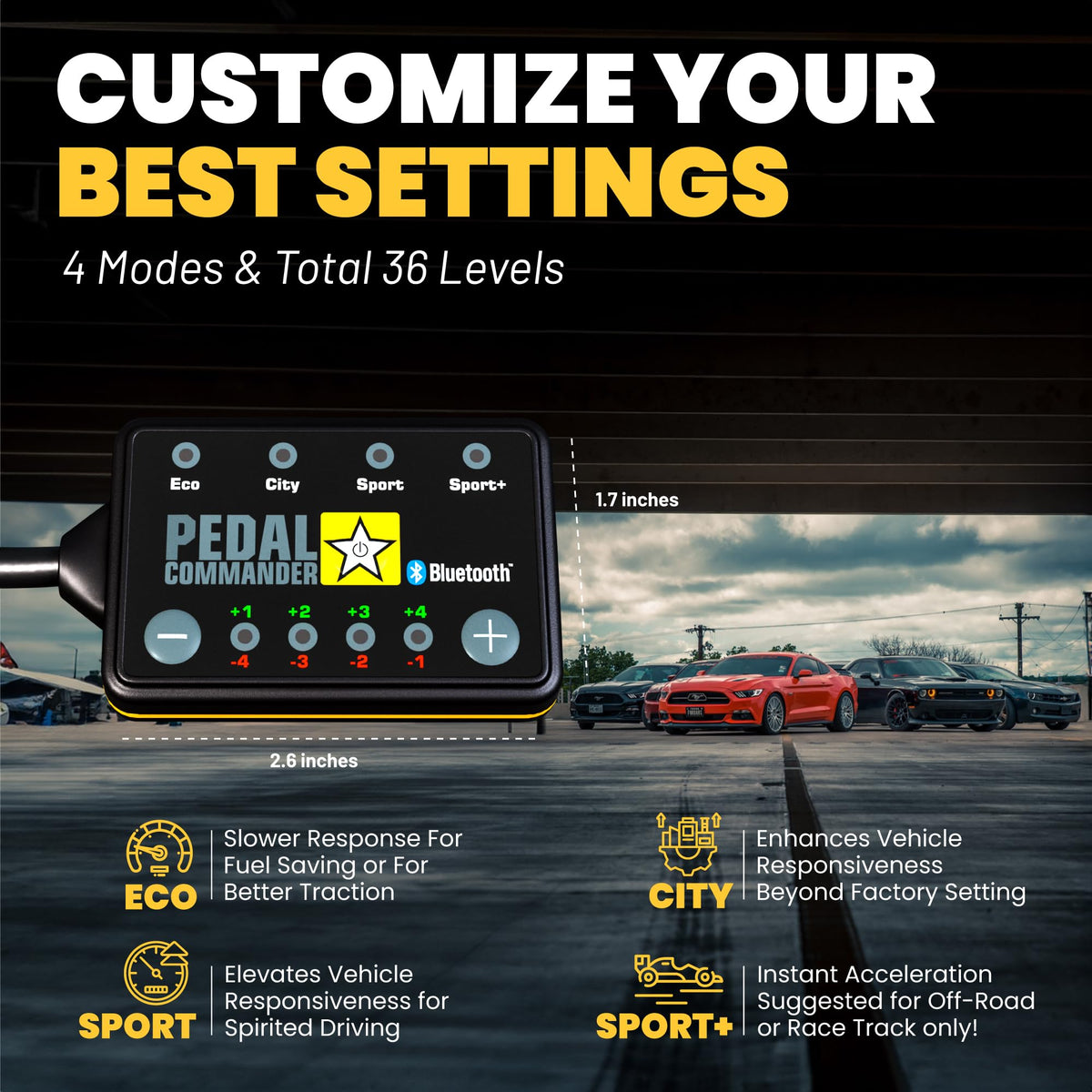 Maximize 4Runner Performance - Instantly improve acceleration and eliminate throttle lag with Pedal Commander, the ultimate plug-and-play tuner for your Toyota 4Runner (2010-2024). | 4 Adjustable Driving Modes, 36 Sensitivity Levels - Switch between Eco, City, Sport, and Sport+ to customize your throttle response for fuel efficiency or high-performance driving in any condition. | Enhance Fuel Efficiency - Eco Mode reduces throttle sensitivity to optimize fuel consumption. -perfect for daily driving or long trips. | Easy Bluetooth Control & Installation - Install in minutes with a plug-and-play design and fine-tune settings wirelessly via the Pedal Commander app. | Warranty-Safe & Mod Friendly - This throttle programmer leaves no ECU trace and works seamlessly with other performance mods, tuners, and cold air intakes. | Designed for Toyota 4Runner 2010-2024: The Pedal Commander throttle response controller is compatible with SR5, Limited, TRD Off Road, Platinum, TRD Pro, Trail, Venture (2.0L, 4.0L)