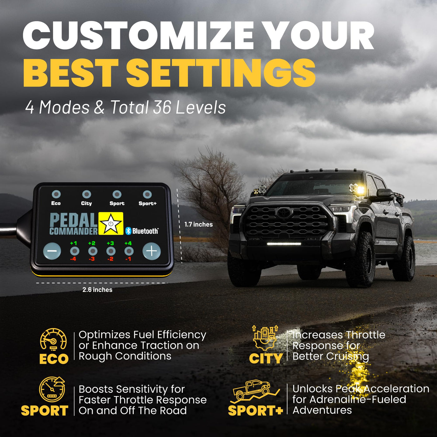 Compatible with Toyota Tundra accessories and Tundra performance parts, the Pedal Commander throttle response controller can help you adjust your gas pedal throttle response. How does Pedal Commander throttle controller work? Older vehicles were operated on mechanical throttle cables, which means everything happened instantaneously. Todays newer vehicles lack the responsiveness that came with older throttle cables because the vehicles computer now controls them. It doesnt matter howfast you push your gas pedal to the floor; you dont have access to all the power your vehicle has to offer. Pedal Commander allows you to control your throttle response as you wish with its 4 modes and 36 sensitive settings. Transform your vehicle with an easy-to-install upgrade solution, throttle response controller, and performance upgrade exclusively designed for your specific make and model. Easy Installation: Pedal Commander throttle controller is designed for effortless DIY installation. Simply plug it in, follow the user-friendly instructions, and you'll be ready to hit the road within minutes. Key features: Instantly enhance throttle response and take control of your vehicle's acceleration response. Pedal Commander throttle response controller compatible with Toyota Tundra 2022, 2023, 2024 models.