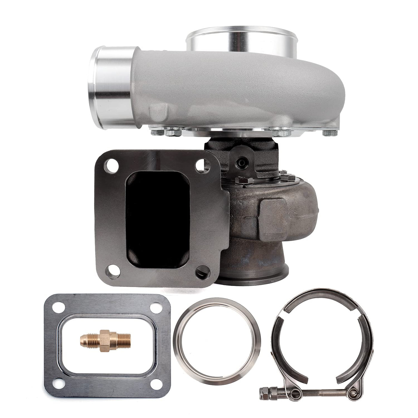 Description Compressor Wheel: 66*82Mm Turbine Wheel: 68*62Mm Compressor Inlet: 4.0 Hose Compressor Outlet: 2.5 Hose Turbine Inlet: T4 Turbine Outlet: 3? V-Band (3.55?Od) Turbine Housing A/R?0.82A/R Oil Feed: -4 An Connect To The Oil Restrictor Oil Drain: Std T3 Flange Water In/Outlet: M14*1.5