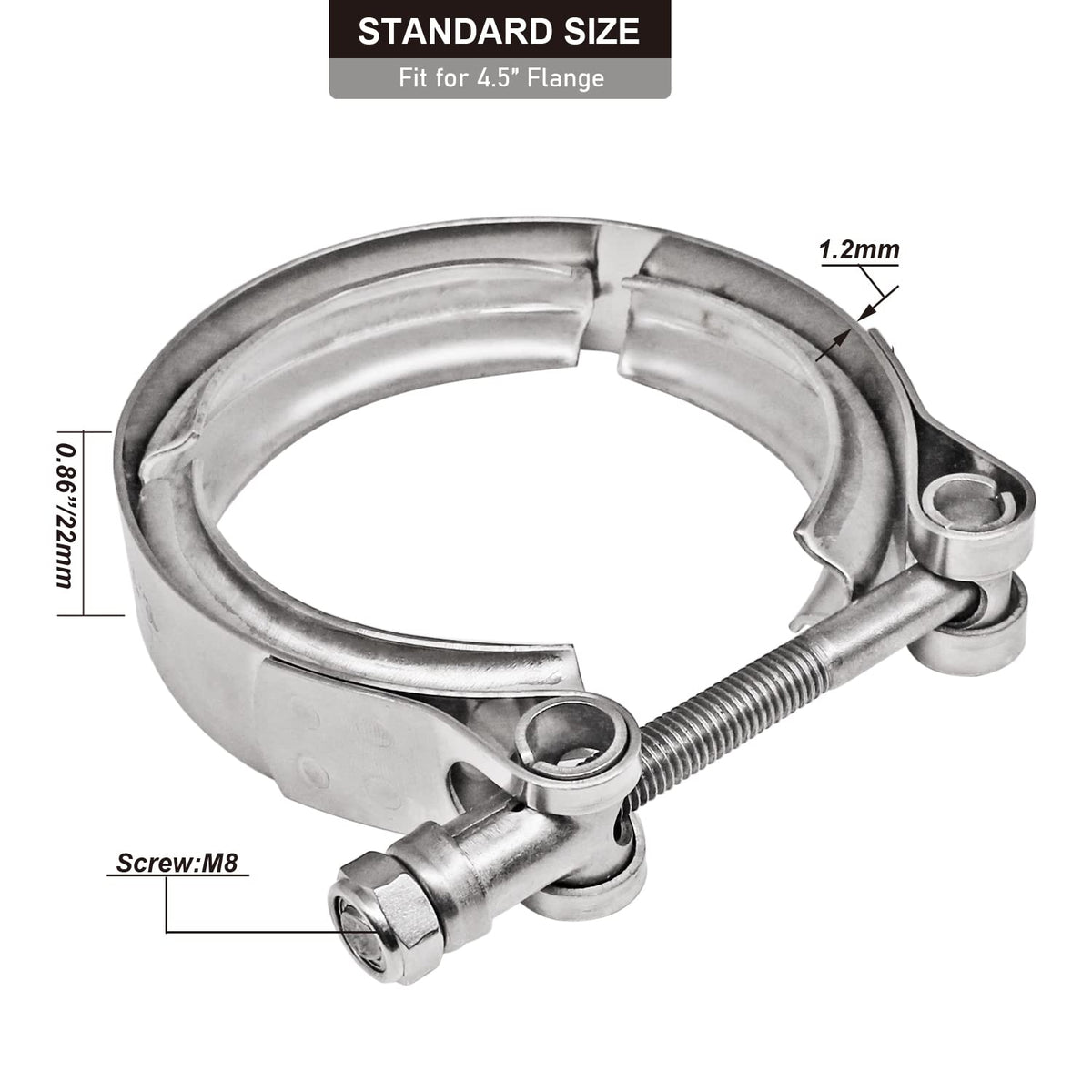 Size & Package Include – 4.5Inch(114Mm), Color: Silver. This V-Band Flange Kit Include One Piece 304 Stainless Steel Standard V Band Clamp (With No Flanges).
