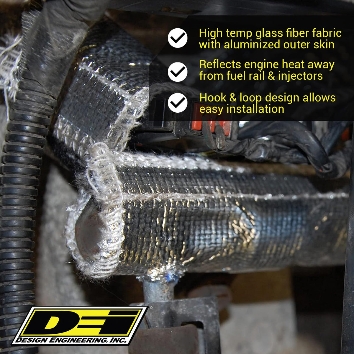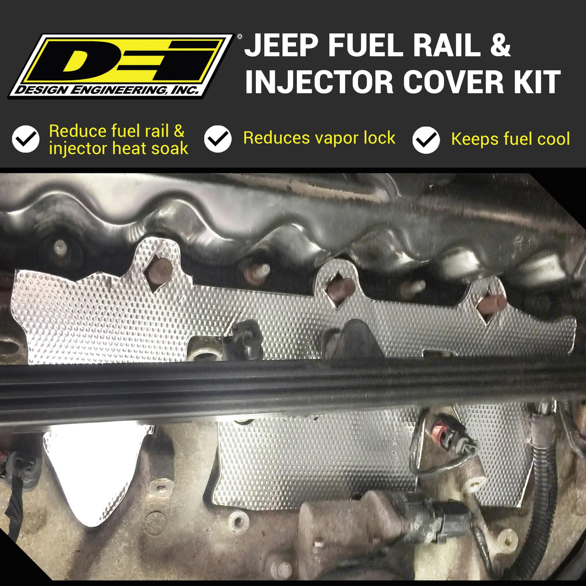 ?? PRODUCT DESCRIPTION: Here at Design Engineering, we have come up with a solution for a common heat soak & vapor lock problem in Jeep models with inline 6 engines (1997-2004). Our amazingly easy to install heat protection barrier kit reduces heat soak on both the fuel rail and injectors. This heat protection in turn aids in reducing vapor lock and helps in keeping fuel cool. The manifold cover is made from a dual sided aluminum barrier with a high temp insulation sandwiched between Prevent engine and fuel breakdown with our professional heat shield installation kit. ?? WHY & WHERE TO USE: Our new Fuel Rail & Injector Cover Kit is equipment built to fit Jeep Wrangler or Cherokee models 1997-2004 that have a 4.0 Liter inline 6 motor. Our kit helps this engine by reducing fuel rail & injector fuel temps which in turn reduces the chances of vapor lock. Our design protects both the injectors & fuel rail from radiant engine heat. This high performance, quality thermal kit includes everything you need for a clean and complete installation. Boost your vehicle's performance today. ?? CONTENTS: Each pack contains installation instructions along with the following items listed below for a cleaner and easier install: 1 - Manifold heat shield 1 - Fuel rail heat cover 6 - Fuel injector covers 12 - OE replacement fuel injector O-rings ?? TOOLS NEEDED: For proper installation you will need the following tools on hand: a 10mm socket w/ ratchet & extension, a flathead, screwdriver, and a fuel rail disconnect tool, pick (for removing O-rings). ?? SAFETY: Please make sure that your battery is disconnected, and that the engine is cool before starting the install process. After installation check for fuel leaks. Please refer to your vehicle's service manual for the exact fuel injector & fuel supply line removal instructions and guidelines. ?? NOTE OF CAUTION: Fuel and vapors are flammable. DO NOT have any open flame near vehicle during installation.