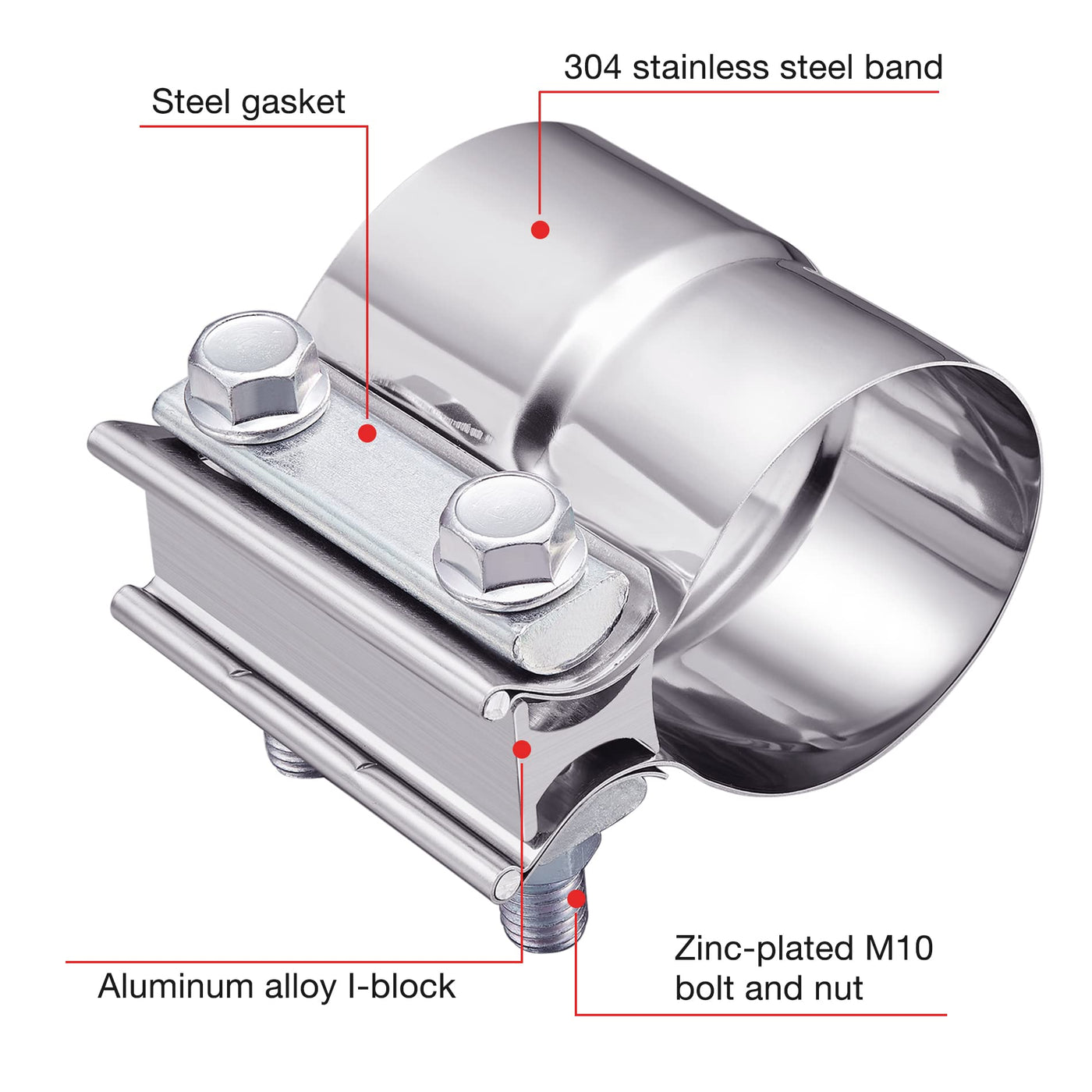 Size: Joins 2.5' Od Pipe To 2.5' Id Pipe, Width Of Strap: 2.94Inch /74.82Mm. | Application: Lap Joint Clamp Is A Simple, Effective Way To Connect Exhaust System Components Such As Pipes, Mufflers, Catalytic Converters Etc. | Advantage: No Welding Design, Easy To Install Or Remove. | Material: 304 Stainless Steel Band, Zinc-Plated M10 Bolt And Nut, Steel Gasket, Aluminum Alloy I-Block. | Feature: The Band Clamps Make The Force Of 360 Evenly Distributed, Provides A Seal And Prevents Material Deformation.Torque: 63 N·M.
