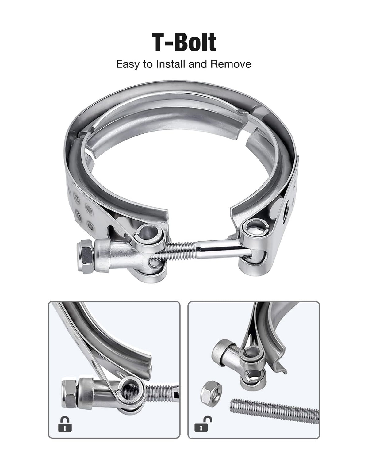 Q: How do I install the V Band Clamp?A: The V Band Clamp is easy to install. Simply slide the clamp onto the pipe and align the flanges before tightening the T-Bolt. This design allows for quick removal and reinstallation when needed.