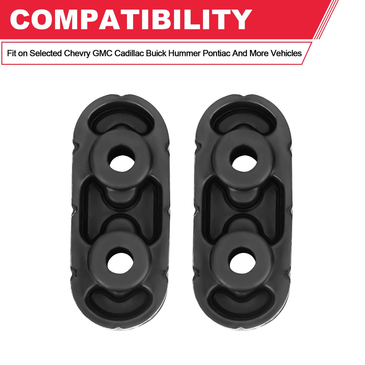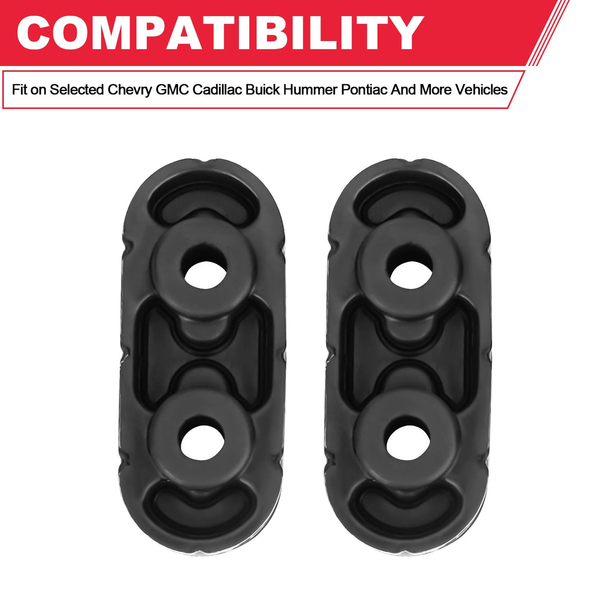 Advantage: Tested & Certified To Meet Or Exceed Oem Quality Standards. 100% Tested Before Leaving The Factory. Made Of High Quality Material. Dimensions: Approximately 4-1/2' X 1-1/2' X 1-3/4' Replace Part Number: 15092802, 15740212, 25956663 Compatible : Fit On Selected Chevry Gmc Cadillac Buick Hummer Pontiac And More Vehicles Includes: 2Pcs Exhaust Muffler Hanger Insulator Warranty: The Exhaust Muffler Hanger Come With 12 Months Warranty. Hassle-Free Return And Refund Policy. Please Buy It With Your Confidence.