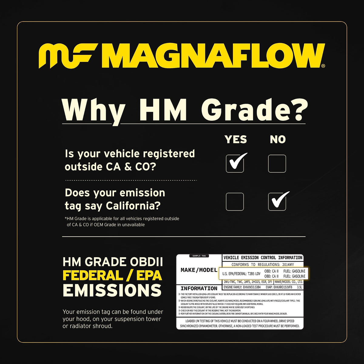 Q: Is the MagnaFlow 99355HMP Universal Catalytic Converter compliant with EPA regulations?A: Yes, the MagnaFlow 99355HMP Universal Catalytic Converter is designed to meet or exceed Federal EPA emissions requirements, making it compliant for federally registered vehicles. However, it is not legal for use in California or certain other states.