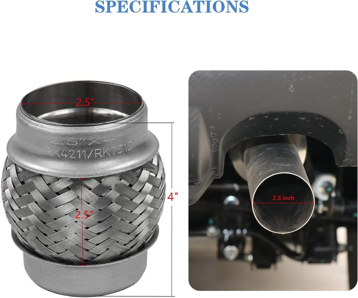 There is no instruction manual; professional installation is highly recommended? Fitment: - Universal For 2.5'' inlet/outlet diameter Flex Pipe .? Product Specification: - Inlet/ Outlet Diameter: 2.5 Inch- Overall Length: 4 Inch- Style: Directly Weld On- Material: Stainless Steel, Double Braided construction- Durable and Corrosion and Water Resistant; Exquisite workmanship90 Days Warranty and 30 days free replacement or return/refund service. If you have any questions, please contact us. Thanks.?? Package Included: 1 x Flex PipeInstallation: Weld on?? How to Install the Flex Pipe1. Grab the bolts holding the flex pipe to the flange on the muffler with a wrench. Turn counterclockwise to remove them. Then pull the flex pipe out of the flange.2. Remove the clamp holding the flex pipe to the exhaust downpipe.3. Pull out the old gasket that sat between the flex pipe and the muffler flange. Then clean out the flange.4. Hammer out any dents from the end of the exhaust downpipe. Loosen the nuts holding the muffler and downpipe. 5. Coat a new muffler gasket with exhaust sealer, then place it in the muffler flange and fit the end of the new flex pipe over it.6. Coat the end of the downpipe with more exhaust sealant and place the free end of the new flex pipe over it. Adjust the position of the muffler and downpipe until the flex pipe is straight but free of tension.7. Thread bolts through the holes in the end of the flex pipe attached to the muffler flange. Tighten them to secure the pipe to the flange.8. Place a new clamp around the flex pipe where it meets the downpipe and tighten it. Retighten the bolts holding the muffler and downpipe and cut any plastic ties that are wrapped around the flex pipe.