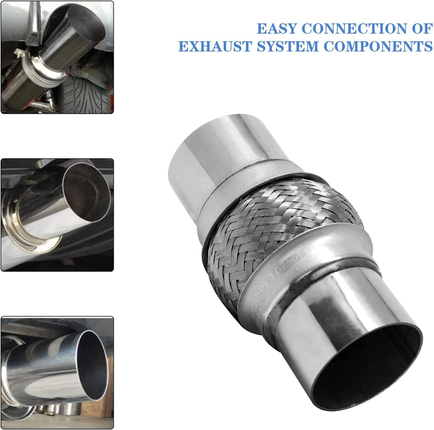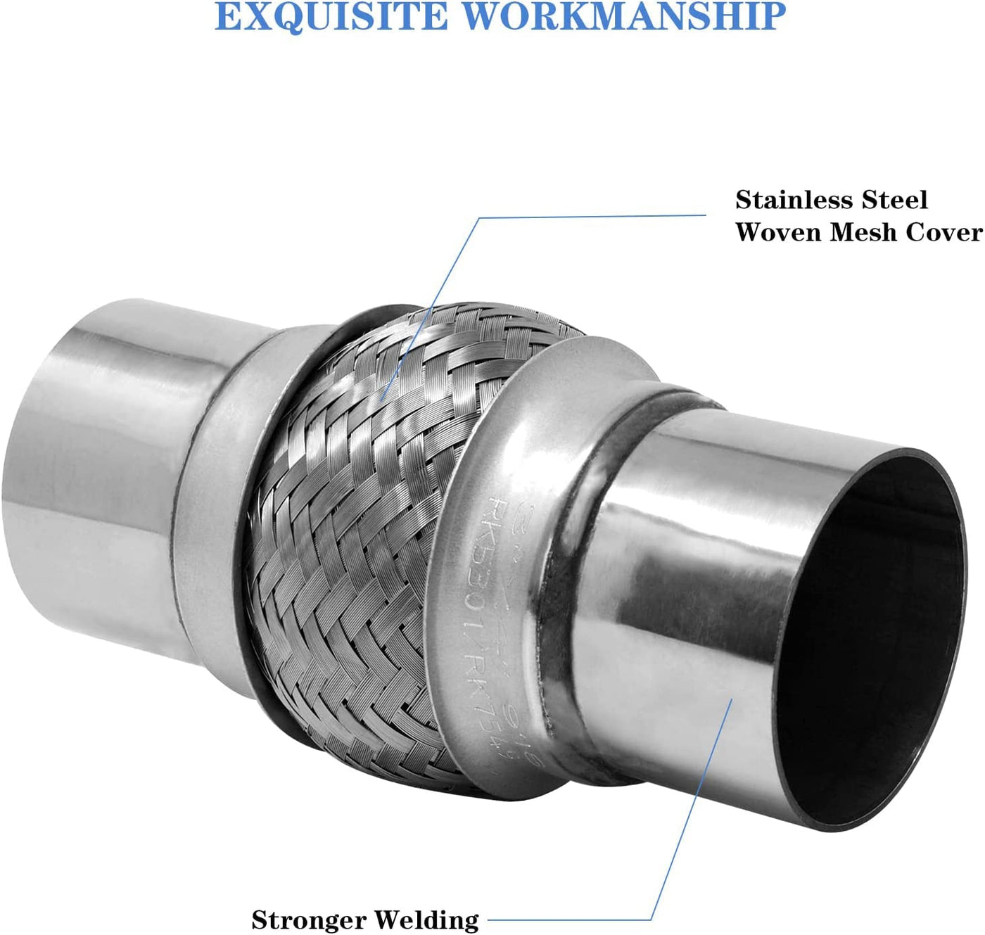 Fitment: Size:2.5''x4''x8''Universal for 2.5'' inlet/outlet diameter Flex Pipe . Product Specification: Inlet/ Outlet Diameter: 2.5 Inch Body length: 4 inch Overall Length: 8 Inch Style: Directly Weld On Durable and Corrosion and Water Resistant; Exquisite workmanship Material: Interlock Stainless Steel, Double Braided construction Package Included:2 x Flex Pipe Installation: Weld on How to Install the Flex Pipe 1. Grab the bolts holding the flex pipe to the flange on the muffler with a wrench. Turn counterclockwise to remove them. Then pull the flex pipe out of the flange. 2. Remove the clamp holding the flex pipe to the exhaust downpipe. 3. Pull out the old gasket that sat between the flex pipe and the muffler flange. Then clean out the flange. 4. Hammer out any dents from the end of the exhaust downpipe. Loosen the nuts holding the muffler and downpipe. 5. Coat a new muffler gasket with exhaust sealer, then place it in the muffler flange and fit the end of the new flex pipe over it. 6. Coat the end of the downpipe with more exhaust sealant and place the free end of the new flex pipe over it. Adjust the position of the muffler and downpipe until the flex pipe is straight but free of tension. 7. Thread bolts through the holes in the end of the flex pipe attached to the muffler flange. Tighten them to secure the pipe to the flange. 8. Place a new clamp around the flex pipe where it meets the downpipe and tighten it. Retighten the bolts holding the muffler and downpipe and cut any plastic ties that are wrapped around the flex pipe.