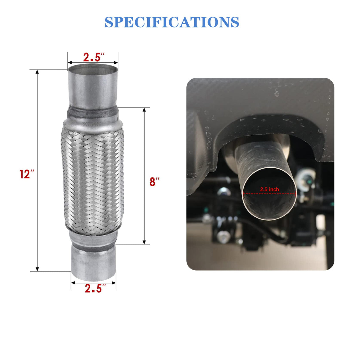 Rp Remarkable Power, Rk7546-2.5'' X 8'' Heavy Duty Stainless Steel Exhaust Flex Pipe 12'' Ol, 2 Pack