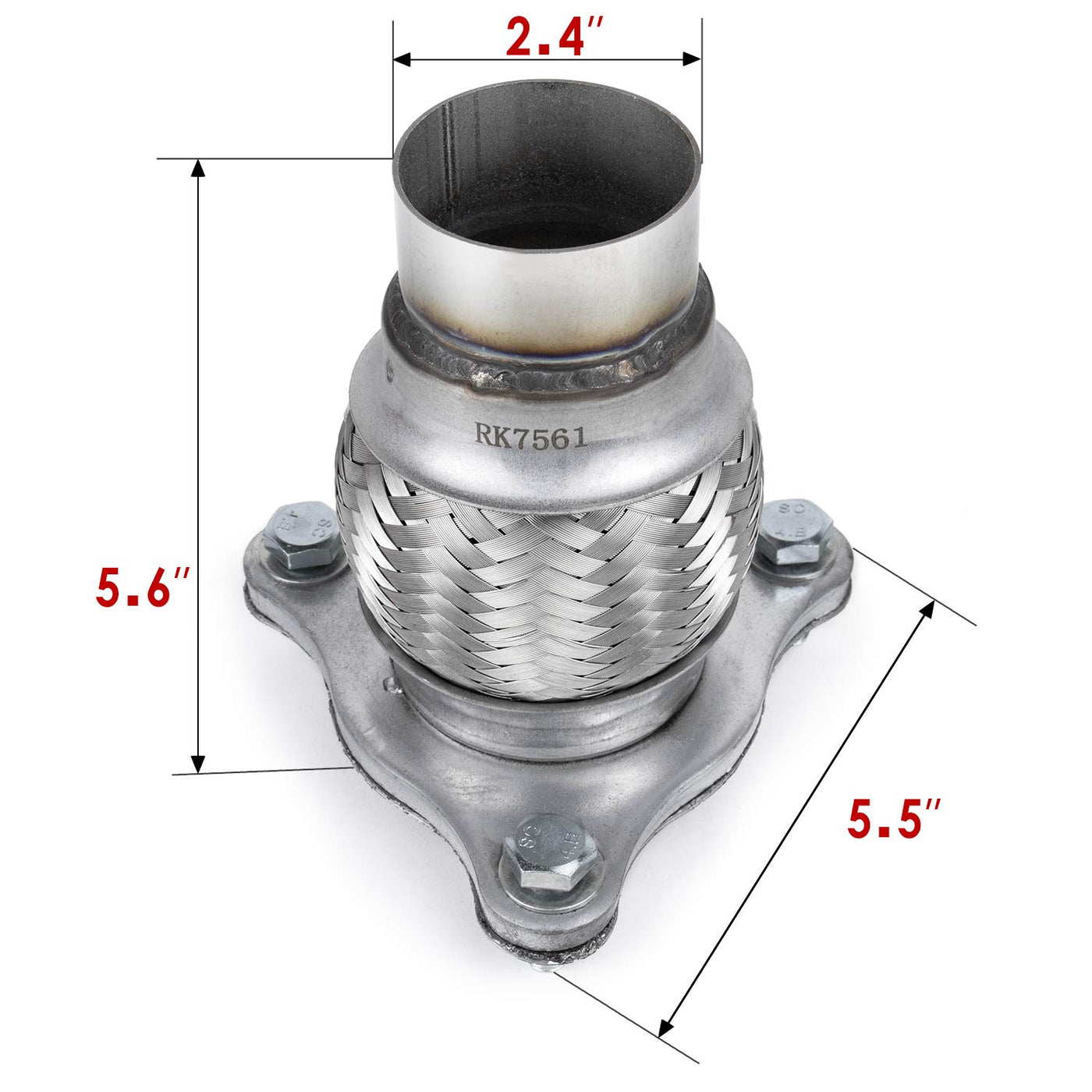 Q: What are the dimensions of the flex pipe?A: The RK7561 flex pipe has an inlet diameter of 2.4 inches and an outlet diameter of 2.525 inches. The body length is 3.75 inches, while the overall length of the pipe is 5.6 inches, making it suitable for a variety of exhaust systems.