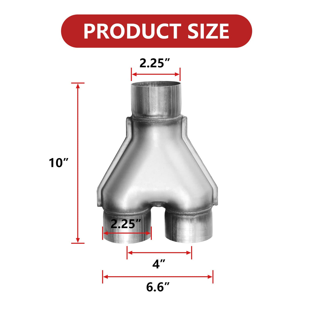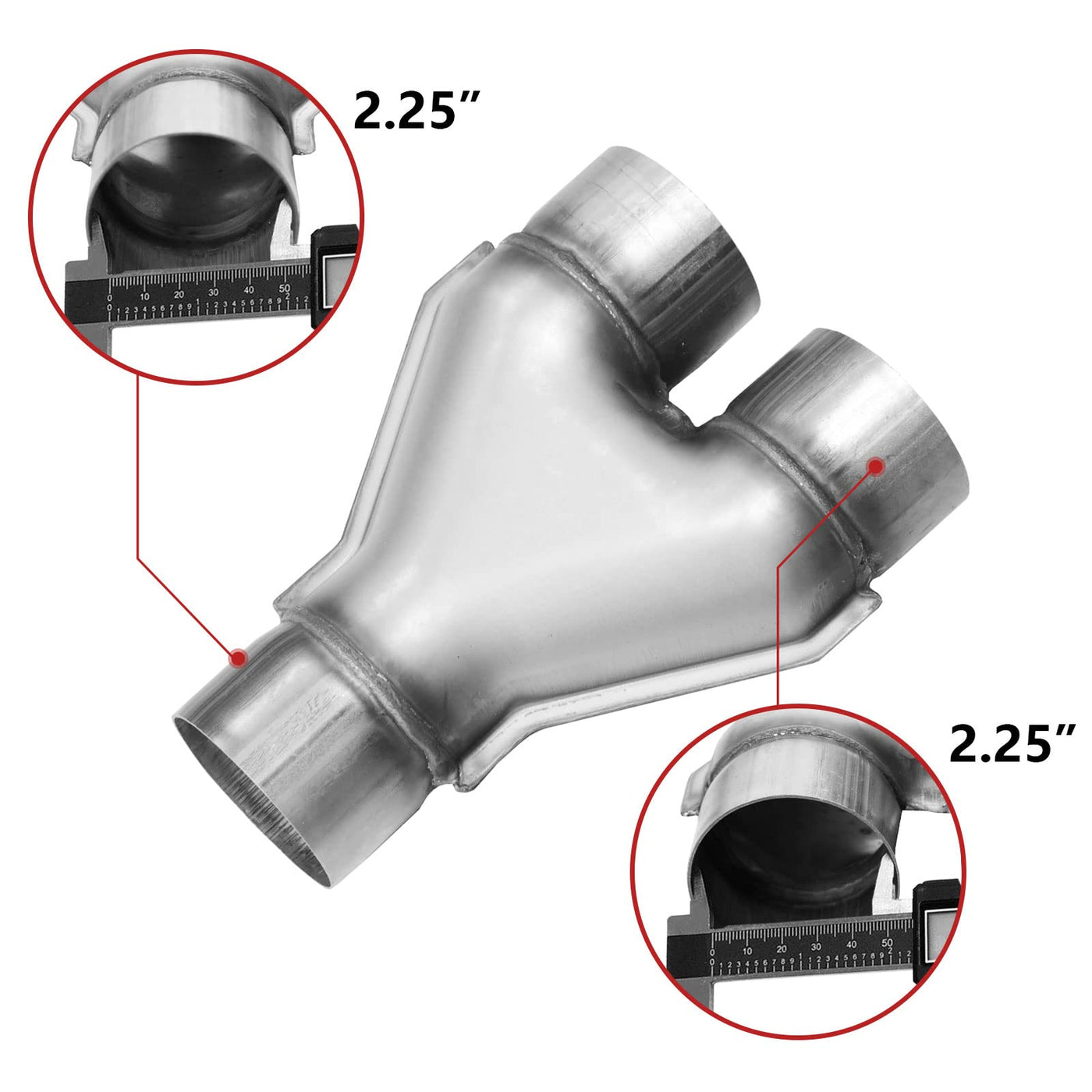Universal 2.25 Inch Exhaust Y Pipe 2.25'' Single to 2.25'' Dual Exhaust Adapter Connector 2 1/4 Inch Y-pipe, Stainless Steel 2.25 Inch Exhaust Y Pipe 10'' Overall Length 409 Stainless Steel Y Pipe 2.25'' Inch ID Single to 2.25'' Inch ID Dual Stamped Exhaust Adapter Connector