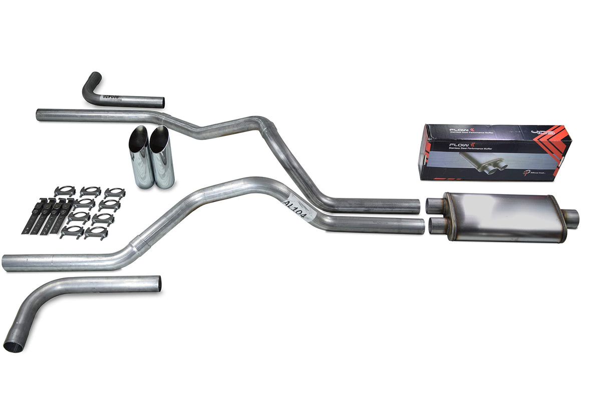 Q: What are the key features of the Truck Exhaust Kit?A: The Truck Exhaust Kit features a Flow II muffler for high performance, 2.5 inch mandrel bent aluminized tail pipes, and includes all necessary installation hardware. This kit is designed to enhance exhaust flow, resulting in better power and fuel economy.