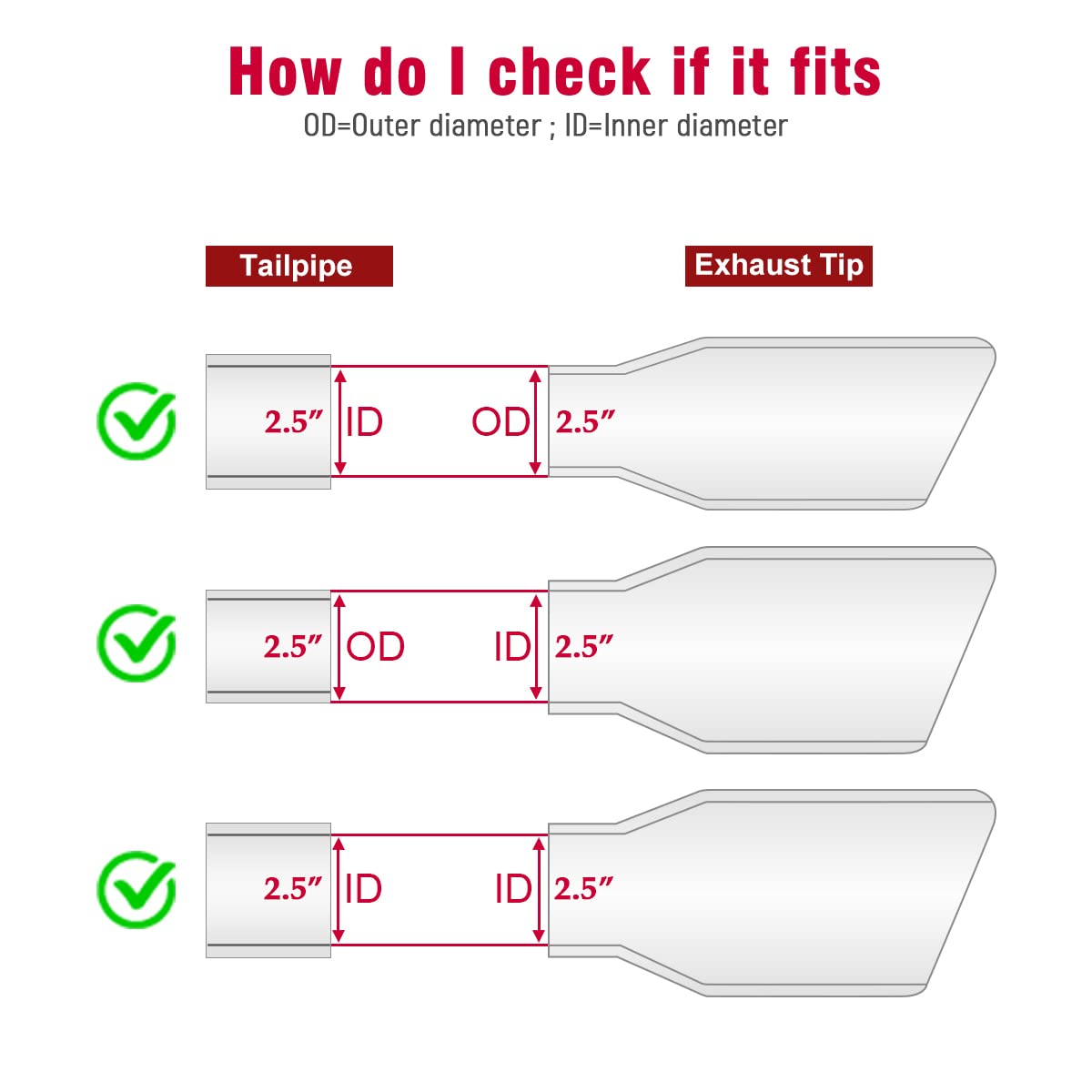 1. Fits: Universal Exhaust Tips, suit 2.5 inch outlet pipe 2. Exhaust Tip Features: *Size: 2.5'' Inlet - 4'' Outlet - 18'' Long *45 Degree Single Angled Cut Design *Installation: Weld On, Easy Installation *Material: Stainless steel with very strong anti-corrosive, never rusty. 3. Exhaust Tip Description: *Features corrosion resistance to alkali solution and most organic and inorganic acids. *Repeated polishing processing, bright as a mirror, highlighting the noble quality. *Perfectly Decorate the Exhaust Pipe of Your Car. 4. Package Included: 2*Stainless Steel 2.5x4x18 inch Exhaust Tip