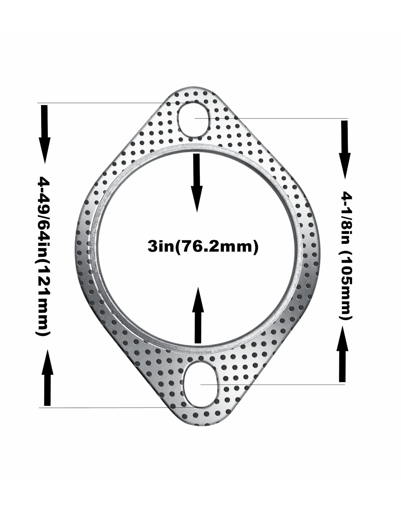 Q: Is this exhaust gasket compatible with all 3" 2-bolt flanges?A: Yes, this gasket is designed to be compatible with most 3" 2-bolt flanges that have a flange ID of 3" (76.2mm) and features slotted bolt hole locations for versatility.