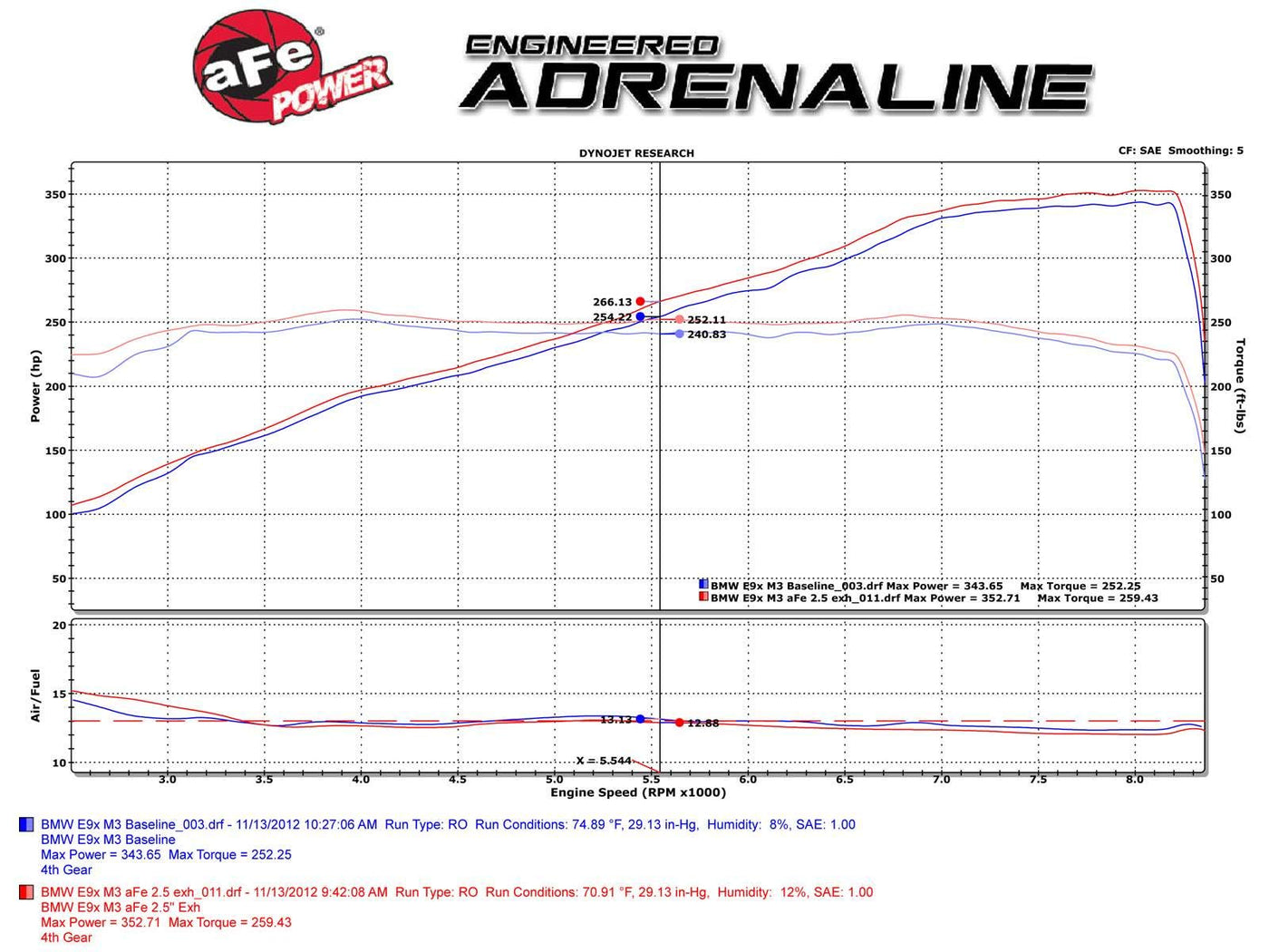 Q: How does the aFe exhaust system improve performance?A: This exhaust system has been tested to produce an increase of 12 horsepower and 11 pounds X feet of torque, enhancing your vehicle's overall performance and responsiveness.