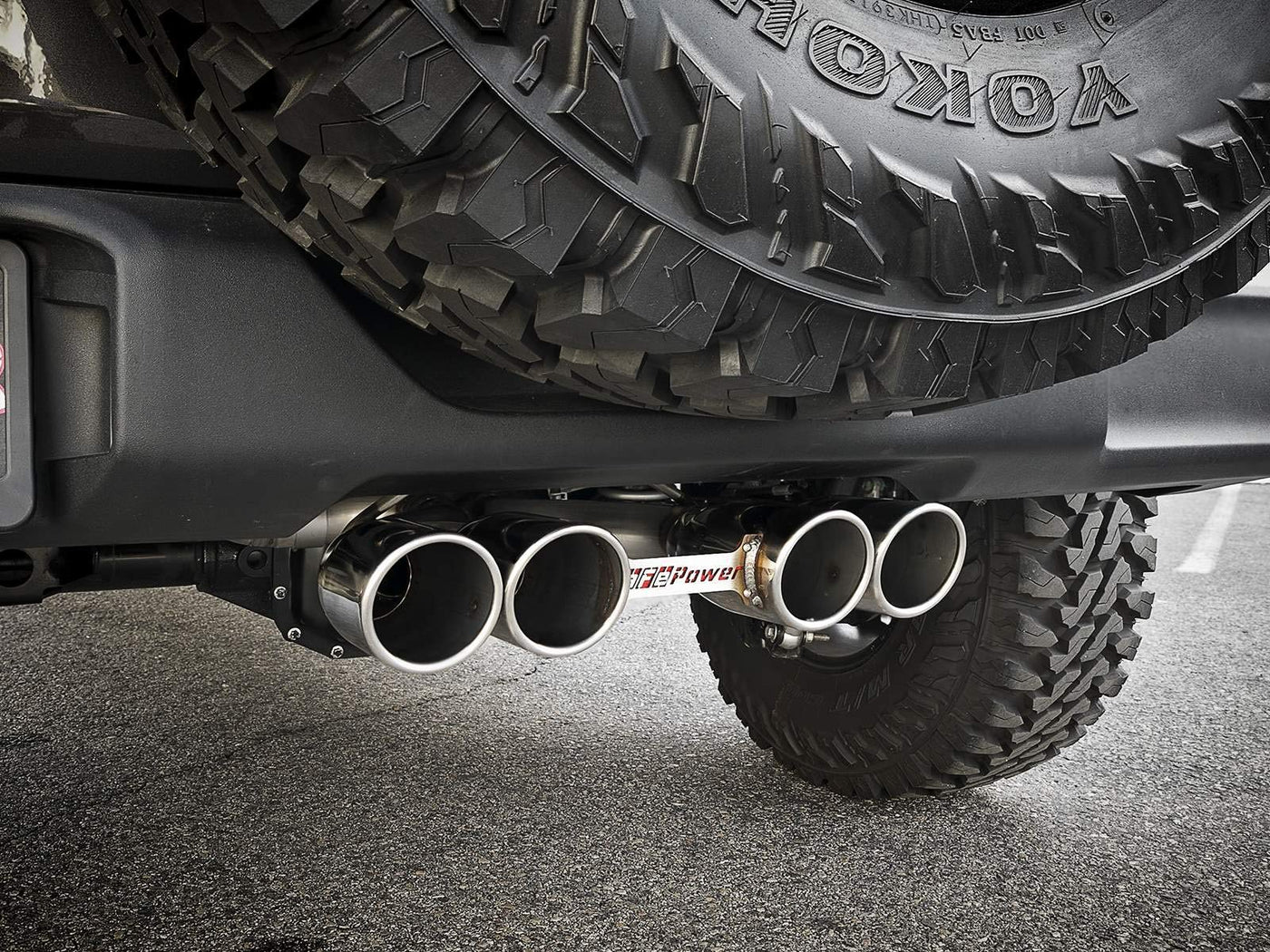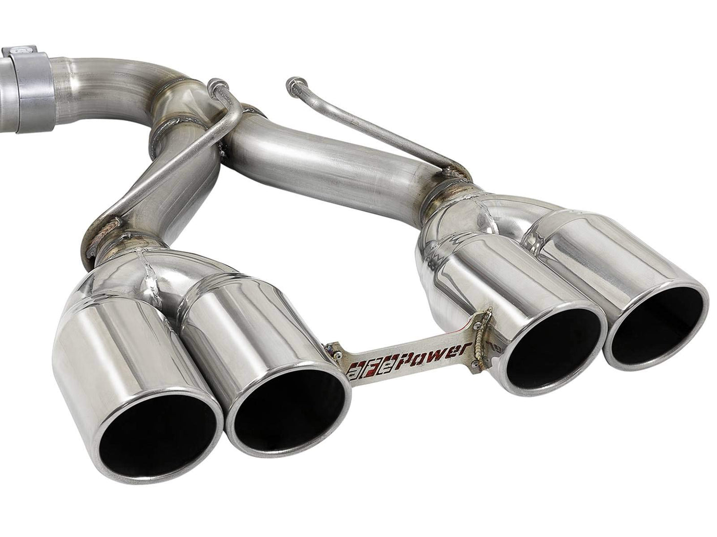 Unique sound and style is what this Rebel Series cat-back exhaust system delivers. 2 1/2 mandrel bent, 304 stainless steel tubing is 100% hand MIG-welded for race proven strength and durability. A high flow stainless steel, metallic black powder coated muffler delivers a powerful exhaust tone. The system uses factory mounting locations for an easy install that stays put under any driving condition. Finished with rear exit, quad 3 ½” diameter, polished stainless steel tips with our signature laser-cut aFe POWER badge for a unique, custom-styled look.