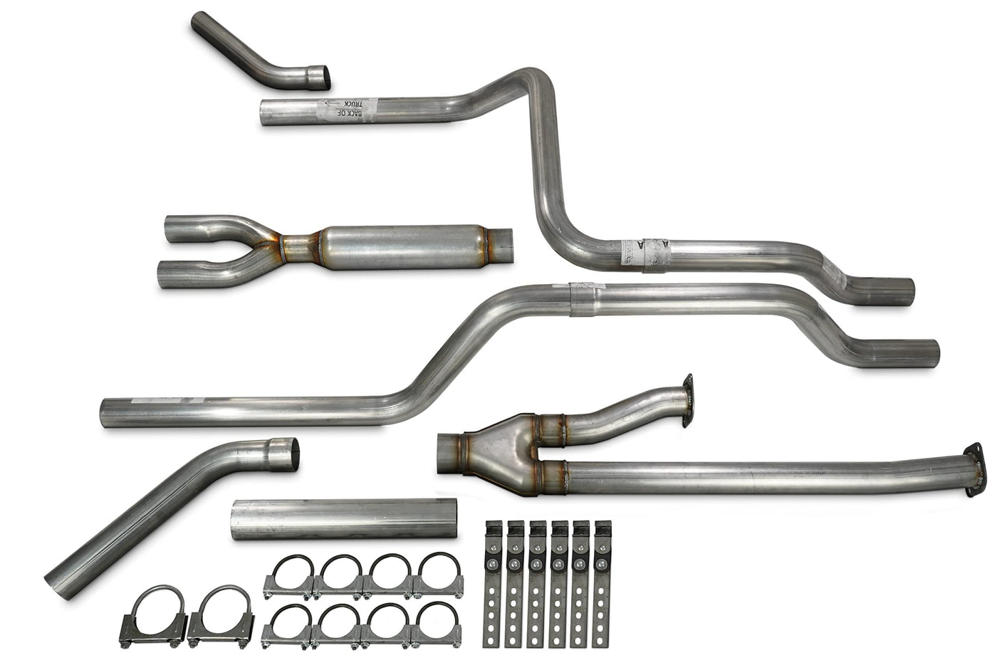 Q: What are the key features of this exhaust kit?A: This exhaust kit features dual 2.5" O.D. mandrel bent aluminized tailpipes, a glasspack muffler, corner exit adapters, and it includes all necessary hardware. It is lighter than the factory exhaust and made from heavy-duty 14-gauge tubing for enhanced durability.