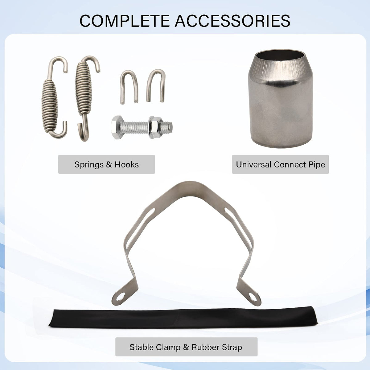 Q: Is installation hardware included with the muffler?A: Yes, the package includes complete accessories such as a mounting clamp, a 38-51 mm adapter, DB killer, springs, hooks, and stable clamps for a hassle-free installation.
