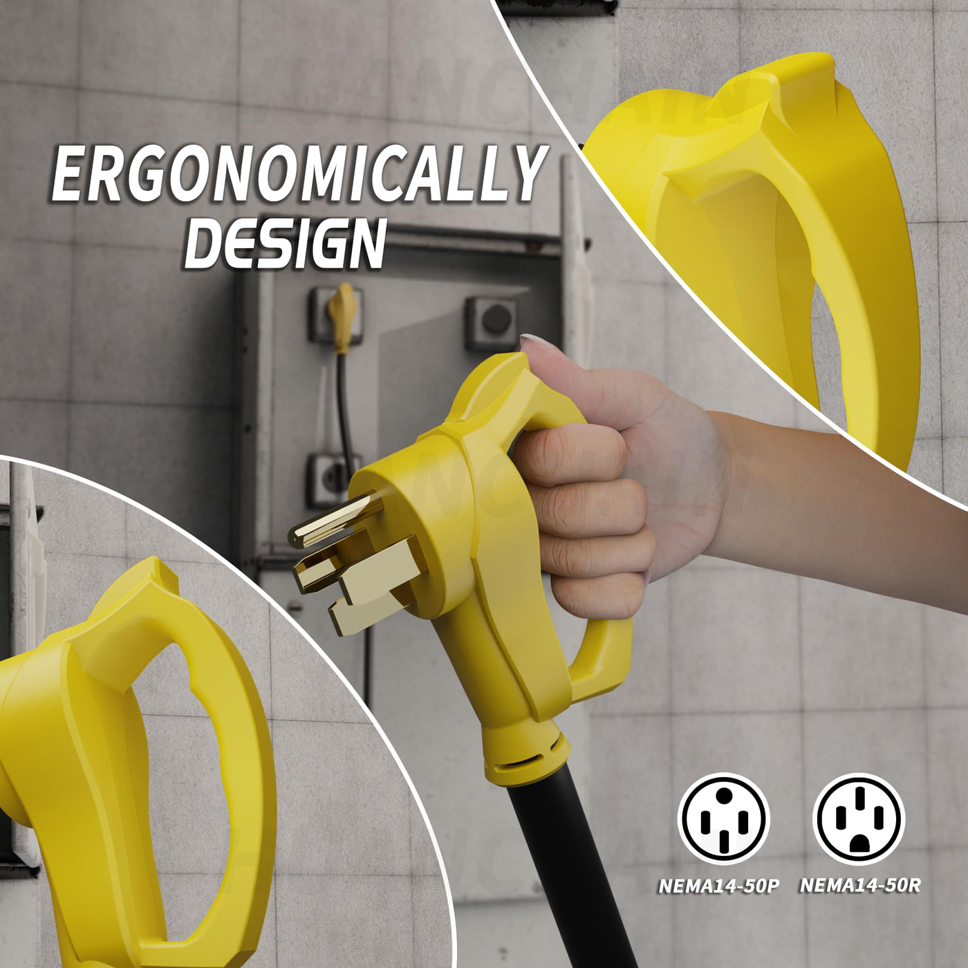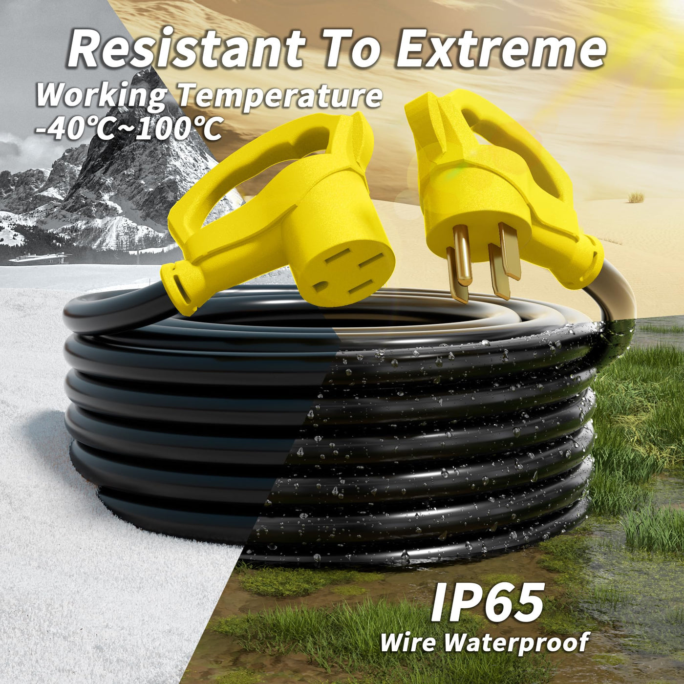 50AMP RV Extension Cord: 4 Prong RV cord 30 foot, STW, 6/3+8/1 AWG, 125V/250V, 50Amax, meeting the power requirements of most RVs/EVs and camping equipment. Male plug NEMA 14-50P, female socket NEMA 14-50R, ETL/cETL listed heavy duty RV extension cord 30 ft. Weatherproof & Durable: RV extension cord 50 amp exhibits excellent weather resistance IP65 waterproof, making it suitable for use in various weather conditions, including sunlight, rain, and low temperatures (-40C). It is constructed with high-quality materials and is heat-resistant, flame-retardant, corrosion-resistant, wear-resistant ensuring safer and more reliable usage for your outdoor RV. Grip Handle Design: Ergonomic handle designed for easy grip, plug/unplug without damaging the cord, making it safer to use. Outdoor RV cord 50 amp is ideal for motorhomes, travel trailers, auto vehicles, and outside campers also suit for Level 2 EV charging such as Tesla Model 3, S, X, and Y. Flexible & Easy to Storage: The NEMA 14-50 extension cord jacket is made with solid and flexible material, allowing for easy bending and storage, adapting to different layouts and environments. Additionally, Equipped with an adjustable cord organizer that enables neat coiling of the cord and hanging, making storage and transportation and preventing tangling and confusion. ETL & Service: 12 months promise RV power cord 50 amp. Your satisfaction is our greatest pursuit, if you may encounter problems during use, you can always communicate with us, and we will solve it in 24 hours.