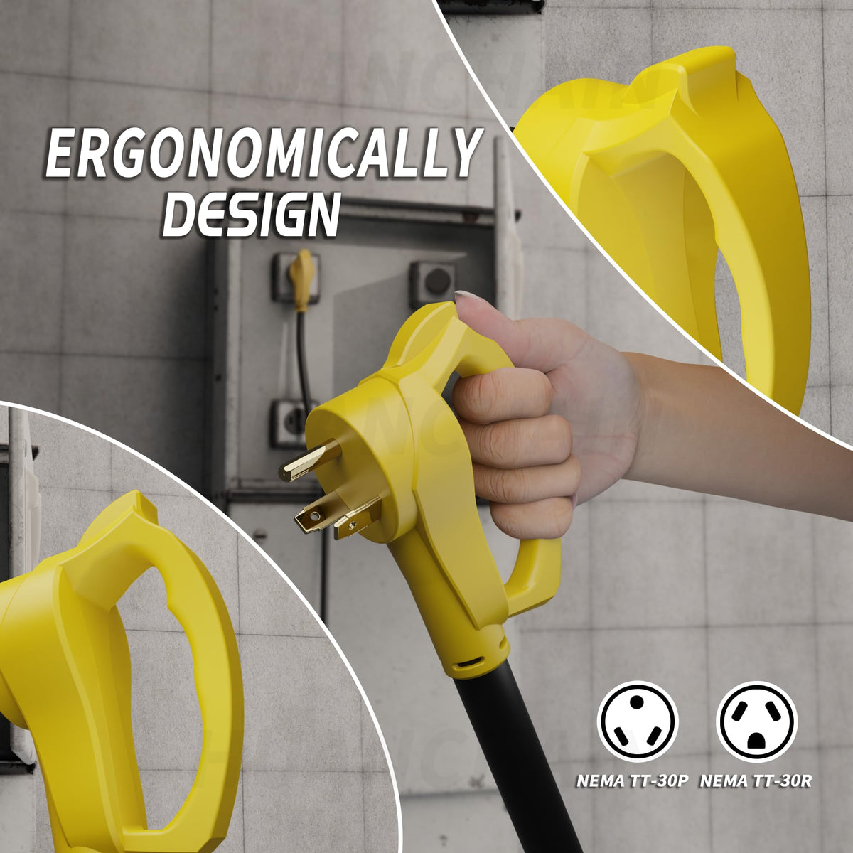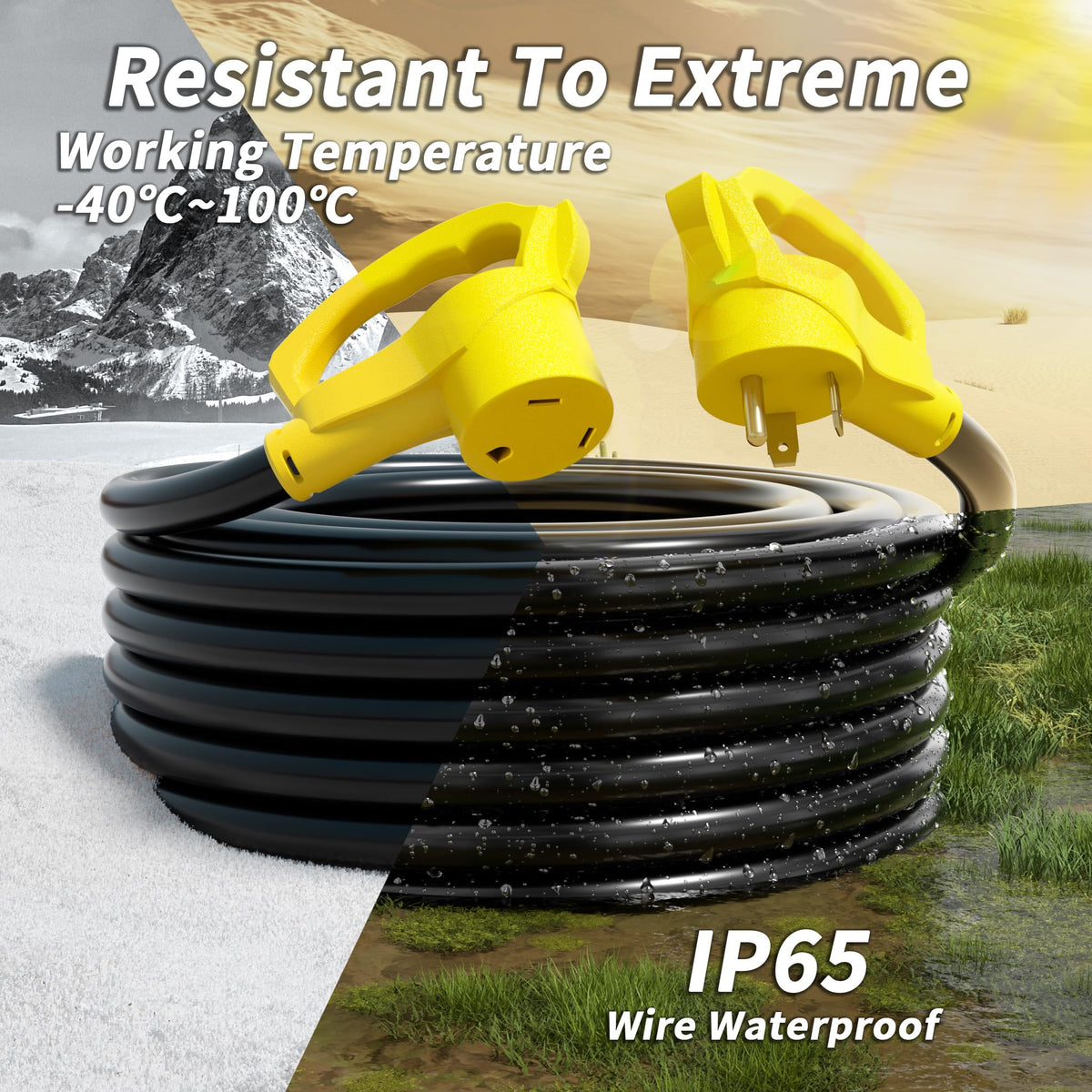 30AMP RV Extension Cord: 3 Prong RV cord 50 foot, STW 10AWG, 125V, 30Amax, meeting the power requirements of most RVs and camping equipment. Male plug NEMA TT-30P, female socket NEMA TT-30R, ETL/cETL listed heavy duty RV extension cord 50 ft. Weatherproof & Durable: RV extension cord 30 amp exhibits excellent weather resistance IP65 waterproof, making it suitable for use in various weather conditions, including sunlight, rain, and low temperatures (-40C). It is constructed with high-quality materials and is heat-resistant, flame-retardant, corrosion-resistant, wear-resistant ensuring safer and more reliable usage for your outdoor RV. Grip Handle Design: Ergonomic handle designed for easy grip, plug/unplug without damaging the cord, making it safer to use. Outdoor RV cord 30 amp is ideal for motorhomes, travel trailers, auto vehicles, and outside campers. Flexible & Easy to Storage: The RV electrical cord jacket is made with solid and flexible material, allowing for easy bending and storage, adapting to different layouts and environments. Additionally, Equipped with an adjustable cord organizer that enables neat coiling of the cord and hanging, making storage and transportation and preventing tangling and confusion. ETL & Service: 12 months promise RV power cord 30 amp. Your satisfaction is our greatest pursuit, if you may encounter problems during use, you can always communicate with us, and we will solve it in 24 hours.