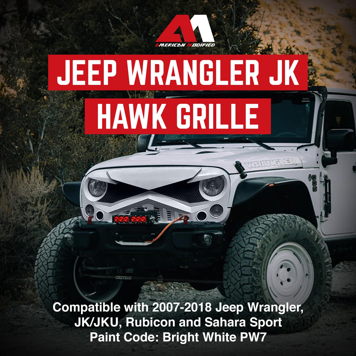 Amp up your gears, enhance your safety and redesign your Jeep for an ultimate off-roading adventure with the AMERIcAN MODIFIED Front Hawke grille compatible with 2007-2018 Jeep Wrangler JK Models Designed with aggressive-off road styling to match your destinations and lifestyle Heads will surely turn as you enjoy your ride with this innovative grille, uniquely designed and well-constructed, made perfectly for those who like their vehicles to stand among the crowd Made from high-quality thermoformed Acrylonitrile Butadiene Styrene (ABS), this extremely durable material is lightweight and impact resistant, capable of withstanding any hazards of off-road driving For added protection, this grille has built-in lighting for improved visibility and to extend safety while on the trail during nighttime Therefore, if youre finally getting tired of that original factory grille, this is a great replacement since its easy to install in just 15 minutes while only using basic hand tools Hurry your pace and dont walk to outfit your vehicle with the quality AMERIcAN MODIFIED Front Hawke grille compatible with 07-18 Jeep Wrangler JK Models that could satisfy both style and safety