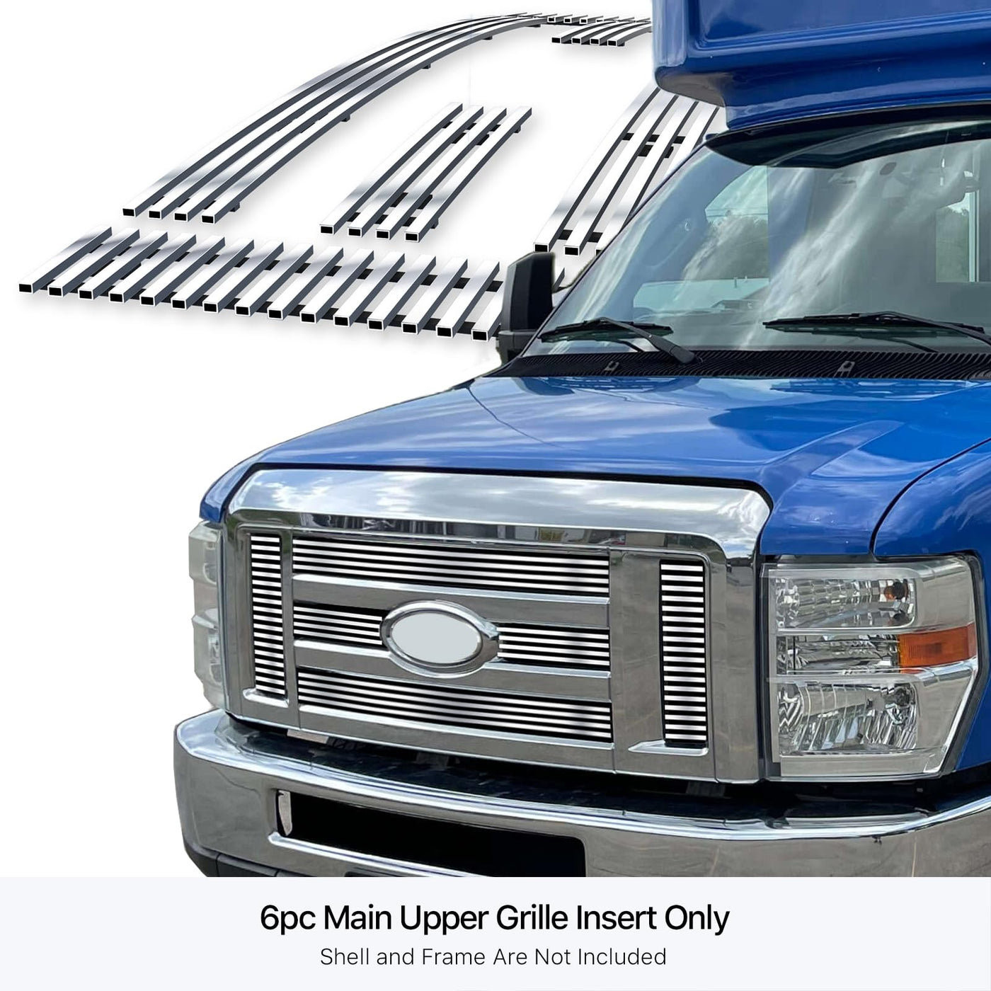 Fitment * Compatible with Ford Econoline 2008-2014 * Compatible with Ford E-Series 2008-2014Package Content This item includes Bolt Over/Overlay/Bolton (Drilling Not Required) Chrome Main Upper Grille Grill Inserts with Polished surface finish, mounting hardwares and installation paper.