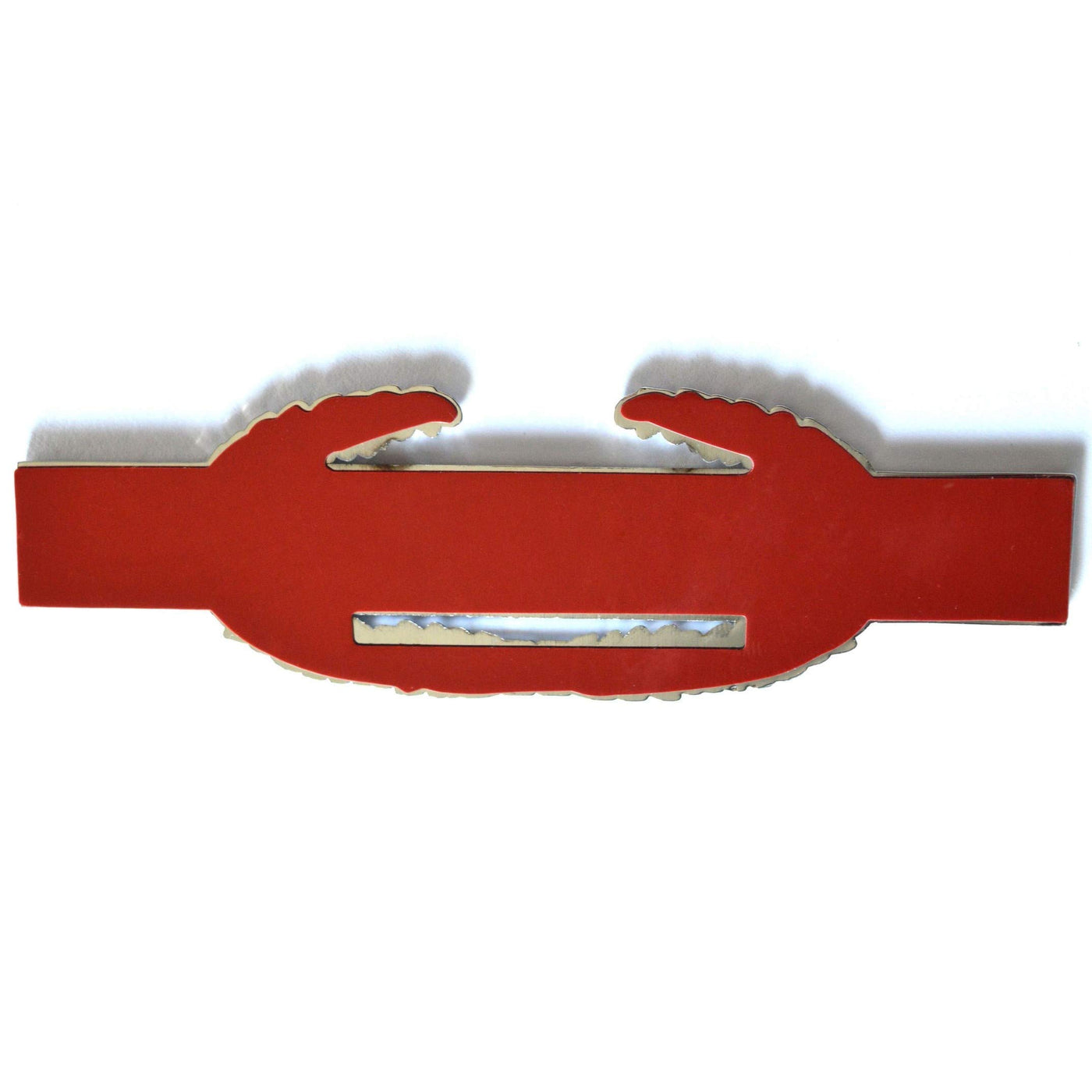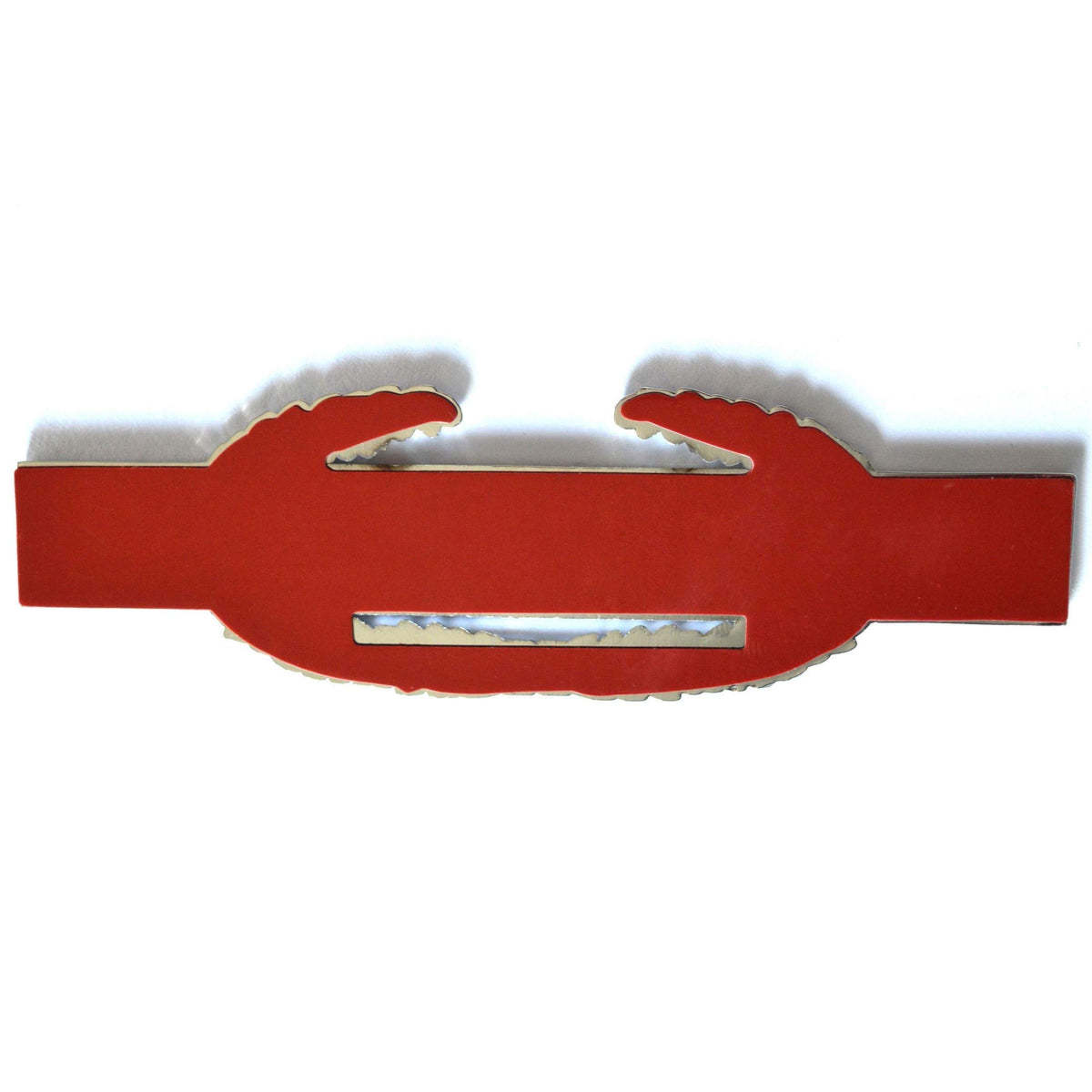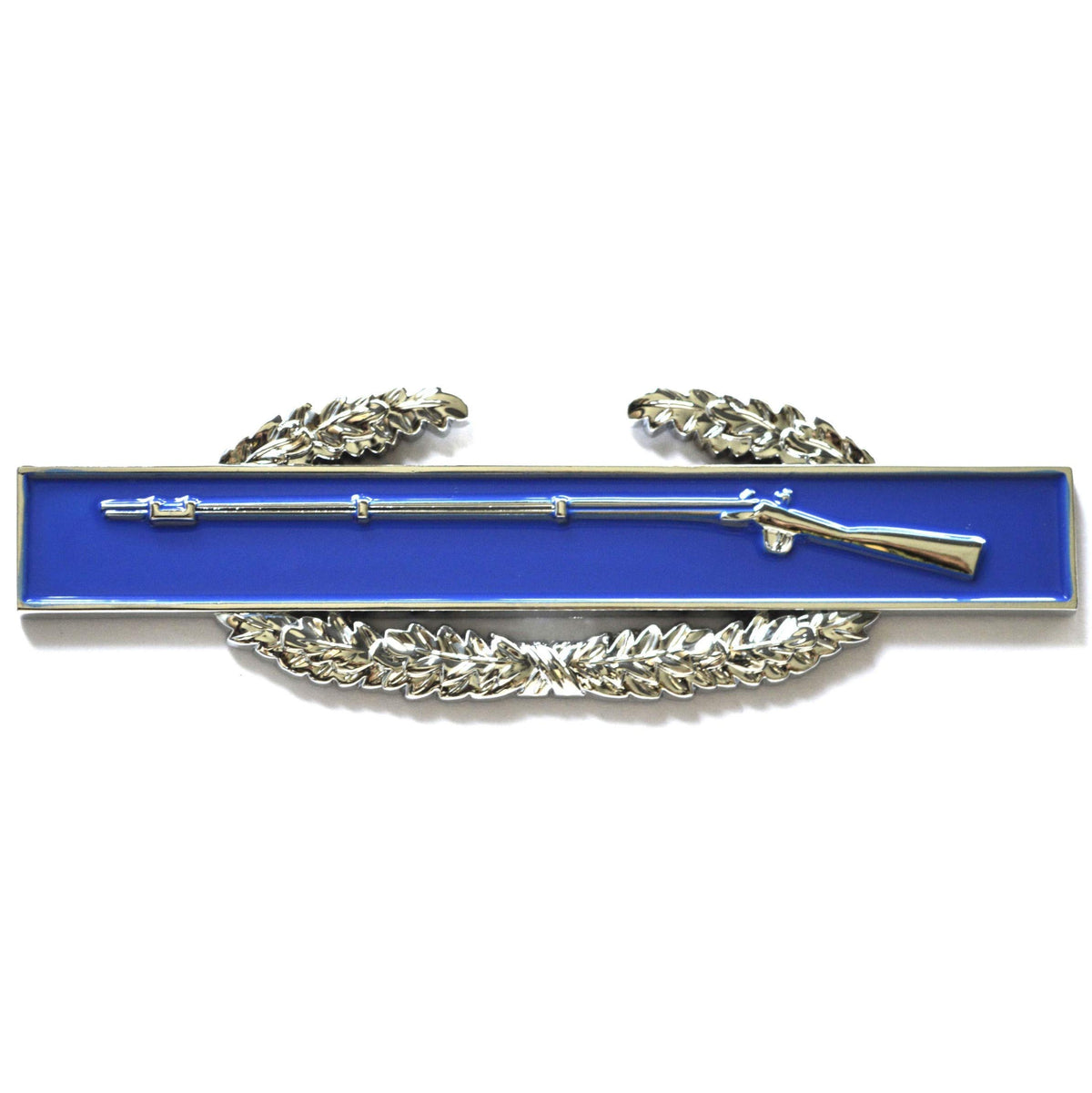 Q: What is the material of the Army Combat Infantryman auto emblem?A: The Army Combat Infantryman auto emblem is made of solid metal and plated with real chrome, ensuring durability and a premium look.