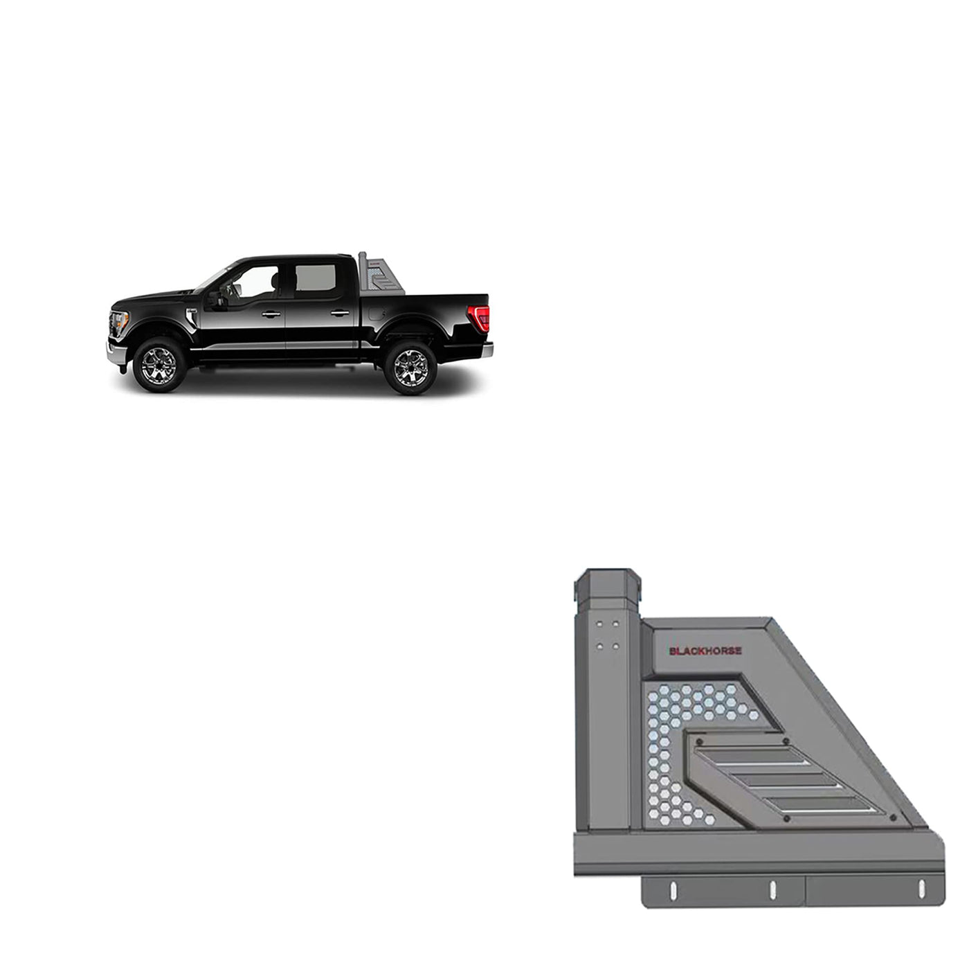 Q: What materials are used in the construction of the roll bar?A: The Black Horse Armour II Roll Bar features a rugged matte black finish, ensuring durability and resistance to the elements, although specific material details are not provided.