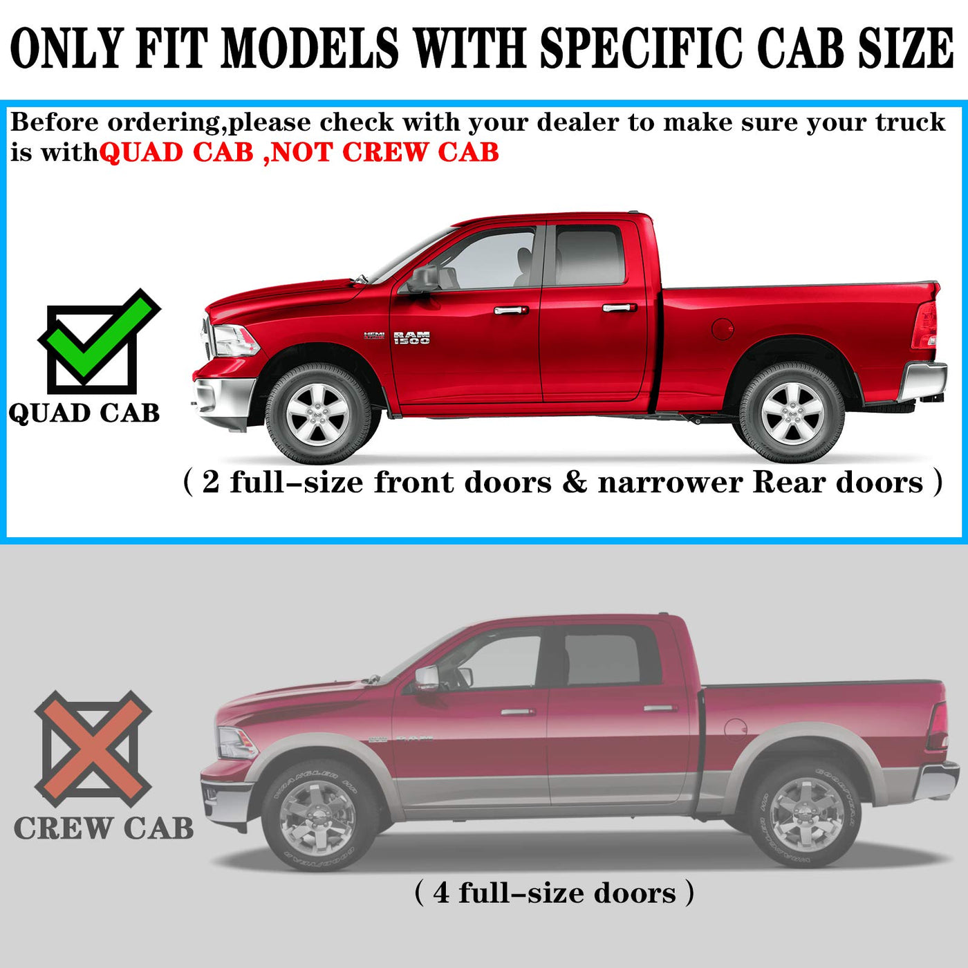Q: What Dodge Ram models are compatible with the COMNOVA Running Boards?A: The COMNOVA Running Boards are compatible with the 2009-2018 Dodge Ram 1500 Quad Cab, including the 2019-2023 Classic models, as well as the 2011-2022 Ram 2500 and 3500 Quad Cab. Please ensure your vehicle is a Quad Cab with 3/4 size rear doors, as they will not fit Crew Cab or Mega Cab models.