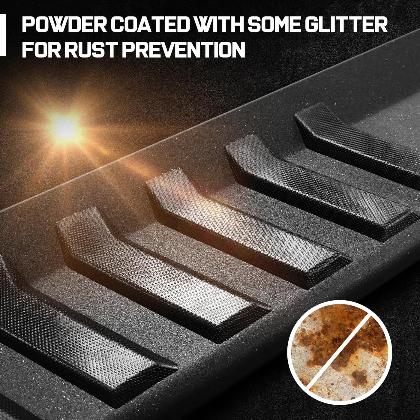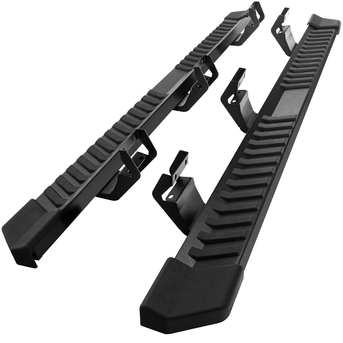 Q: What materials are used in the construction of the running board?A: The running board is made from premium carbon steel with a black powder-coating finish. This material not only provides durability and strength but also includes a textured matte finish for added style and rust prevention.