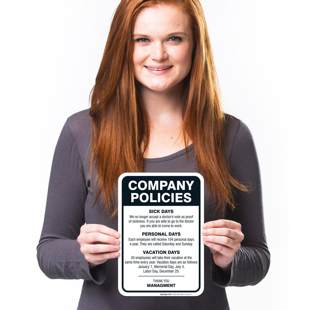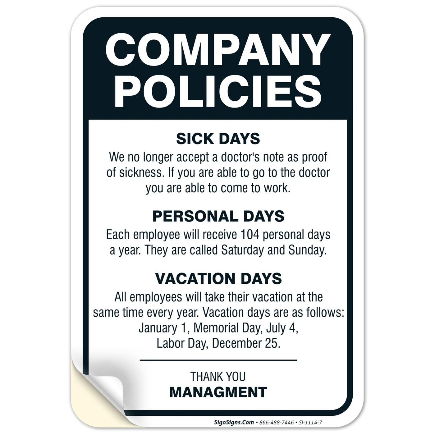 Company Policies Sign, Employees Break Room Decor, 10X7 Inches, 4 Mil Vinyl Decal Stickers Weather Resistant, Made In Usa By Sigo Signs