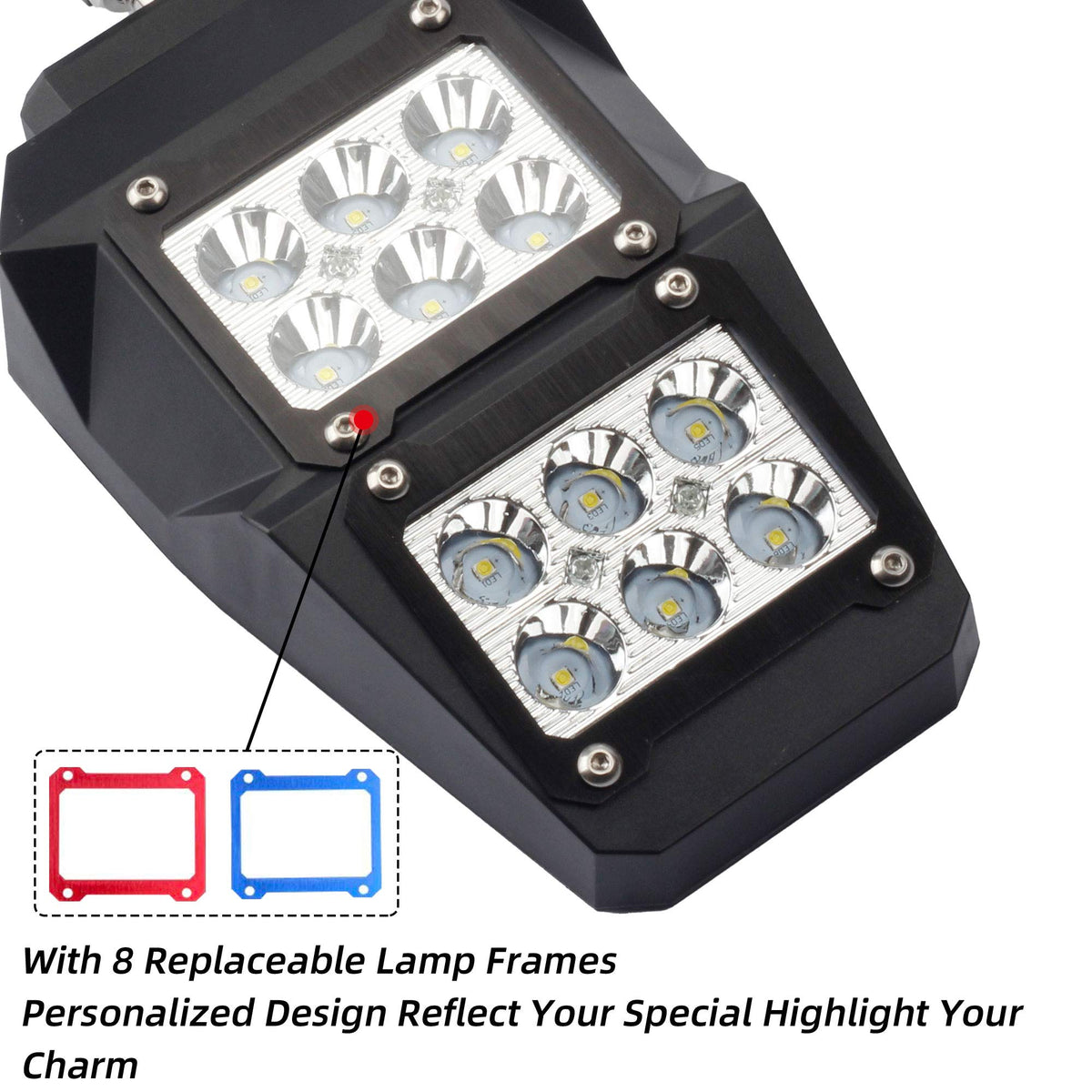 Q: What is included in the package when I purchase these mirrors?A: The package includes 2 side rear view mirrors, 3 wrenches for installation, 4 red lamp frames, and 4 blue lamp frames, providing everything needed for installation and customization.