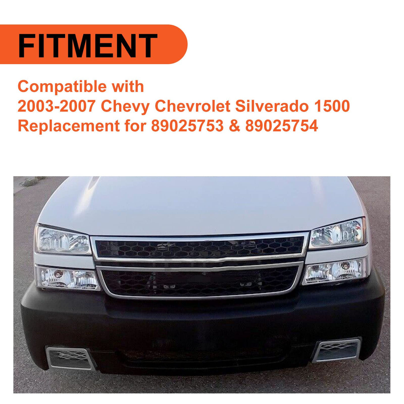 -Fitment: Compatible with 2003-2007 Chevy Chevrolet Silverado 1500. Replacement for 89025753 & 89025754. -Feature: Good compatibility with your Silverado.| Color: Silvery | Made of High Quality lightweight ABS Plastic Material. | Placement on Vehicle: Front Lower. -Description: Gives your car a unique& aggressive style and appearance. High quality plastic construction for higher stability and reliability. Built to strict quality control standards. -Package included: 1 x Bumper Caliper. ** NOTICE: Instructions NOT included. No mounting hardware!!!** -Installation: Directly bolt-on. Professional installation is recommended.